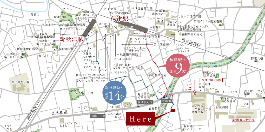 西武池袋線「秋津」駅まで徒歩9分、JR武蔵野線「新秋津」駅まで徒歩14分。現地より徒歩4分の「東星学園」バス停より「秋津駅北口」バス停へスムーズにバスアクセスでき、雨の日も駅へのバス移動が快適です。