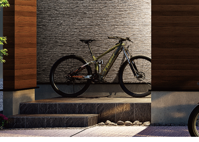 自転車をすっきりと駐輪できるサイクルスペースを確保。雨に濡れにくい玄関脇に配置しました。
