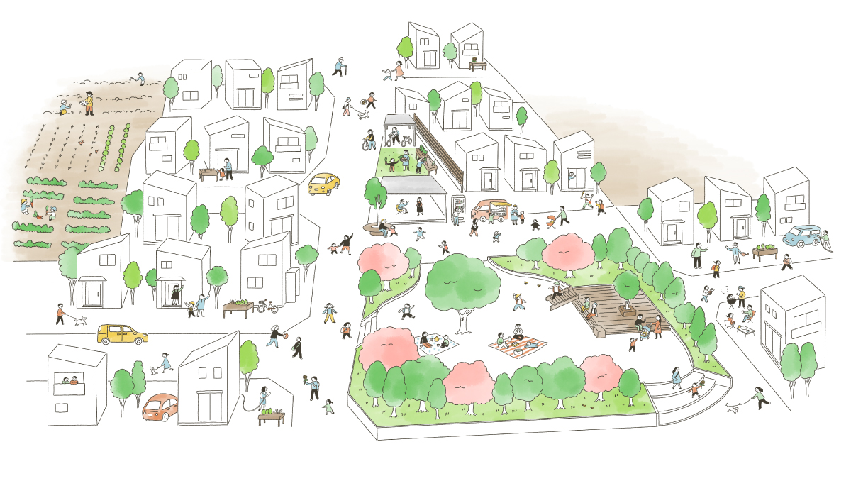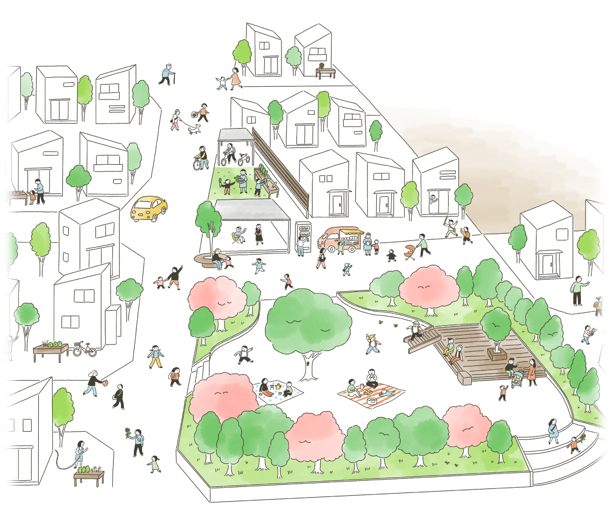 全47邸の街には「空」「木」「石」をテーマとする3つの街区をデザイン。子どもが走り回れる雑木林のような街をテーマに、グランピングやアウトドア気分を満喫できる街を描きました。