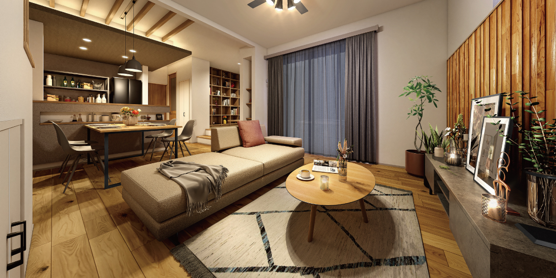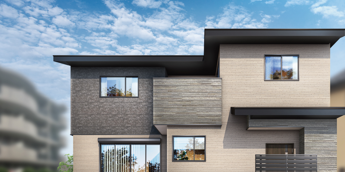 シックなカラーでまとめた外観が印象的なファサード。石目調と木目調のアクセントが上品な温もりを添えて、屋根や建物形状が生み出す陰影による立体的な造形が、住まい全体に凛とした気品を漂わせます。※完成予想図は図面を基に描いたもので実際とは多少異なります。