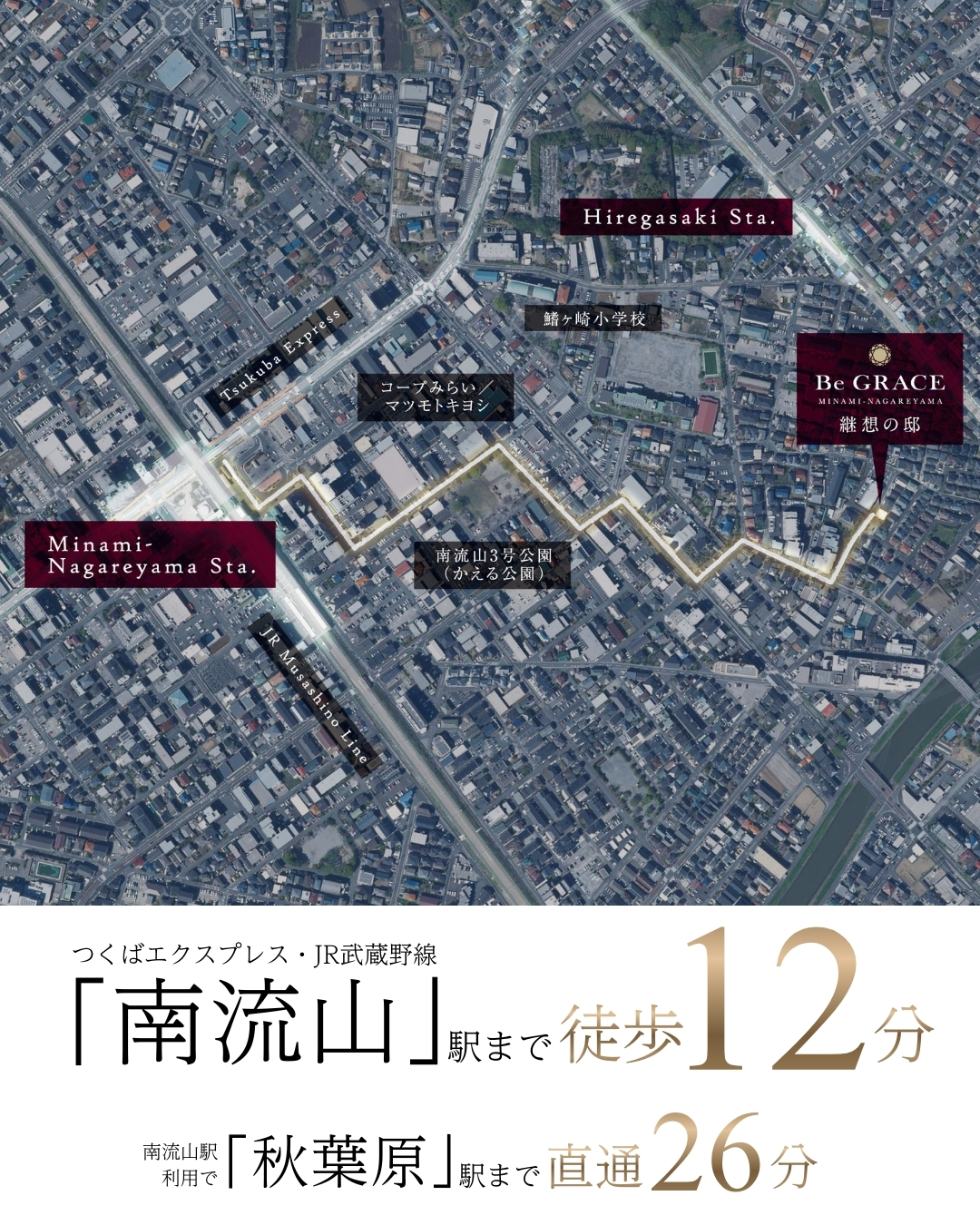 つくばエクスプレス・JR武蔵野線「南流山」駅まで徒歩12分。流鉄流山線「鰭ヶ崎」駅も徒歩5分で利用できます。