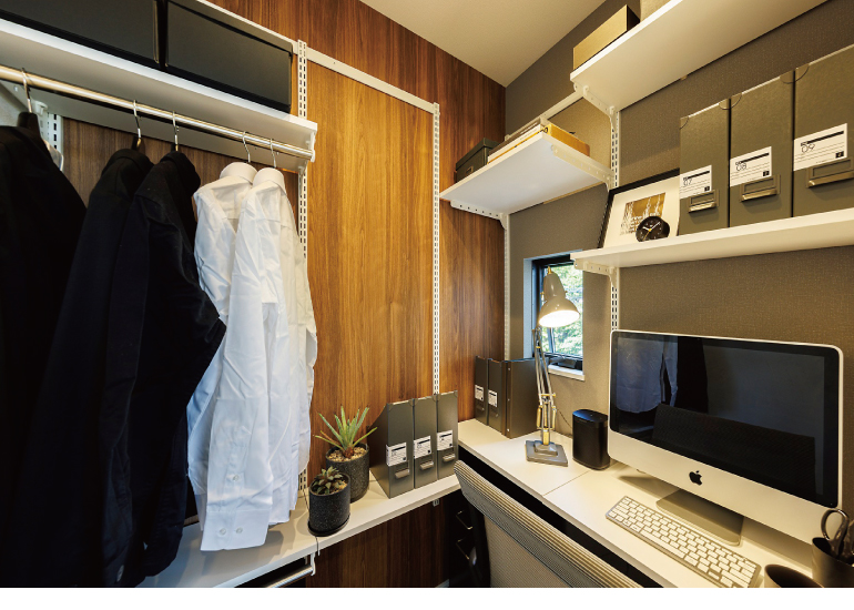 可動棚を備えた、ゆるやかに籠もれる空間。書斎やテレワークに使いやすく、可動棚があるので、お気に入りの書籍や仕事の資料も保管できて便利です。