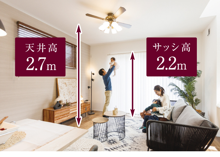 リビングの天井高を2.7m、サッシ高を2.2mに設定し、広々とした団らん空間を創出しました。子どもが余白を感じられる空間づくりで、住まいの中でものびのび自由に過ごせます。