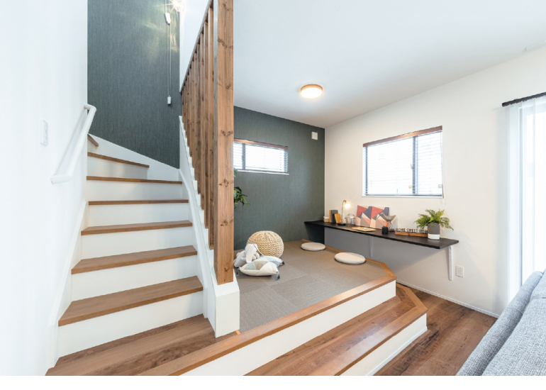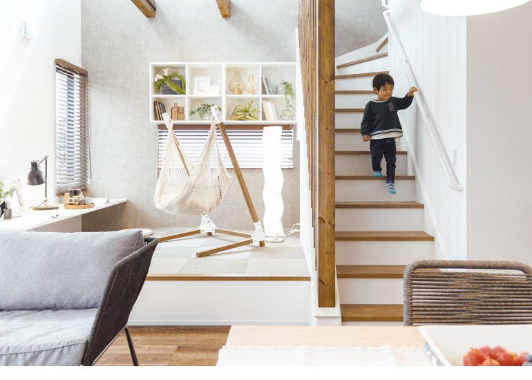 リビングから小上がりになったスペースは、子どもの遊び場にぴったりな自由空間。リビングにいる家族とのコミュニケーションも育めます。