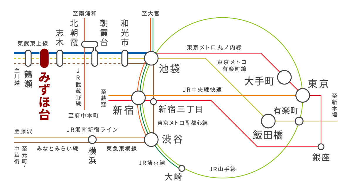 アクセス ●みずほ台駅より池袋駅まで【ラッシュ時: 30分 東武東上線準急(池袋行)利用。和光市駅で東京メトロ副都心線通勤急行(元町・中華街行)に乗換。】