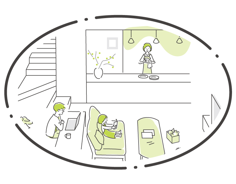 仕事や家事の途中でも家族のことは気になります。ゾーニングされつつも視線が通り家族が見守れる団らん空間です。