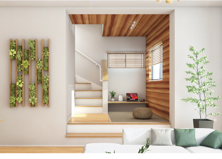 壁の一部と天井に木目調のアクセントクロスを採用した、リビング小上がりの空間。木目が演出するぬくもりに包まれながら、読書や趣味など、自分時間をゆったり味わえます。