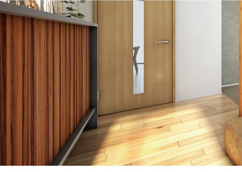 木の味わいと個性をLDKにまとわせ、モダンに装う化粧柱。光や風を通す透かしのあるデザインは上品かつ軽やかで、空間を仕切りながらもさりげない繋がりを描きます。
