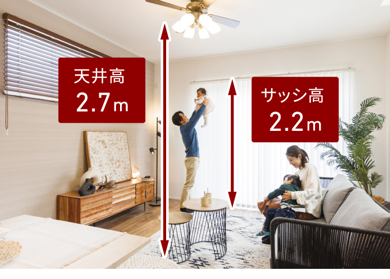 リビングの天井高を2.7m、サッシ高を2.2mに設定し、広々とした団らん空間を創出しました。子どもが余白を感じられる空間づくりで、住まいの中でものびのび自由に過ごせます。