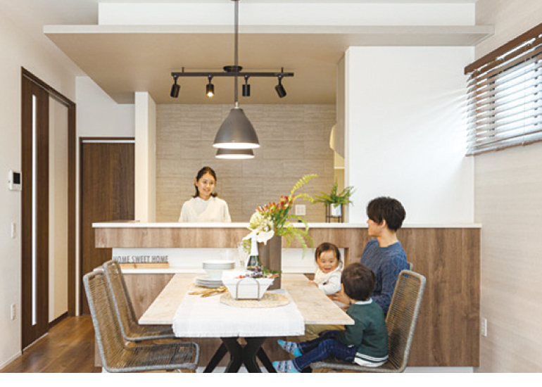 リビングやダイニングと対面になっているうえ、吊り戸棚がないつくりで、開けた視界で家事ができるキッチン。リビングにいる家族を見守れるほか、料理や後片付けをしながら家族との会話を楽しめます。