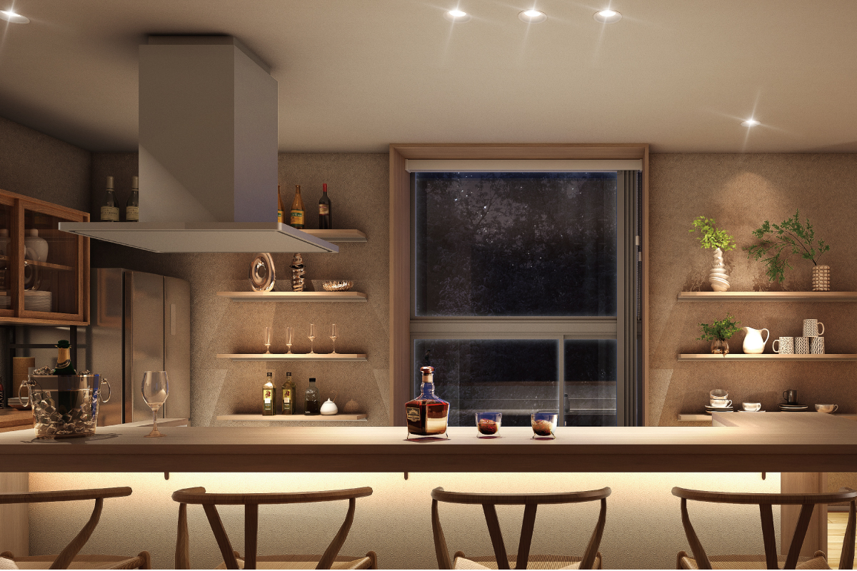 リビングを中心とする集いから、キッチンを中心とする暮らしを提案する『KDL』の中心となるスペース。キッチンと一体となったカウンターでは、ライブキッチンやお気に入りのカフェで過ごすようなひとときを楽しめます。また、キッチンにはパノラマサッシを設けているので、カウンターから隣接する緑地の景観を眺めることもできます。