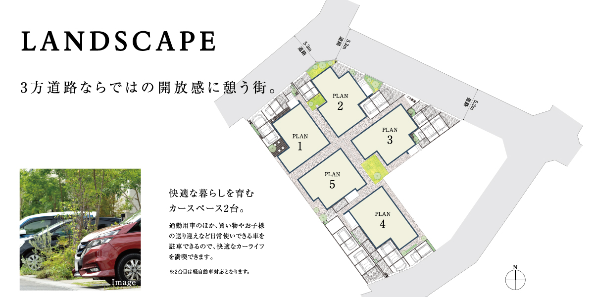 ◆カースペース2台標準、心地よい開放感に包まれる全5邸