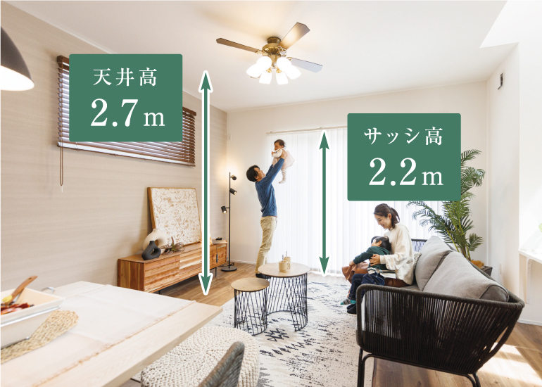リビングの天井高を2.7m、サッシ高を2.2mに設定し、陽光がたっぷり射し込む広々とした団らん空間を創出しました。余白を感じられる空間づくりで、住まいの中でものびのび自由に過ごせます。