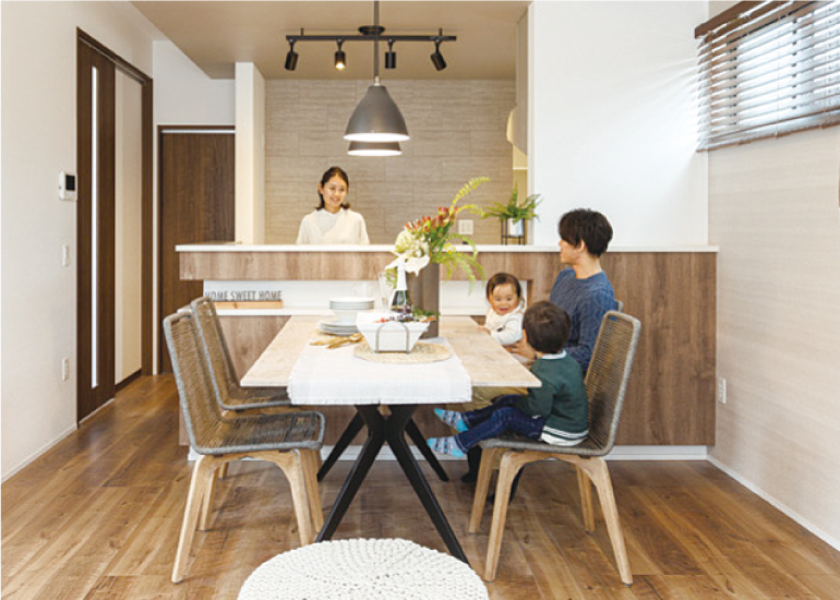 リビングやダイニングと対面になっているうえ、吊り戸棚がないつくりで、開けた視界で家事ができるキッチン。リビングにいる家族を見守れるほか、料理や後片付けをしながら家族との会話を楽しめます。