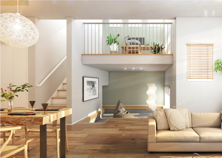 吹き抜けが明るく家族の気配を感じながら仕事や作業に集中できるスキップフロア。下部のフロアはカーペット敷きで、子どもの遊び場にも使いやすい空間です。/PLAN 3