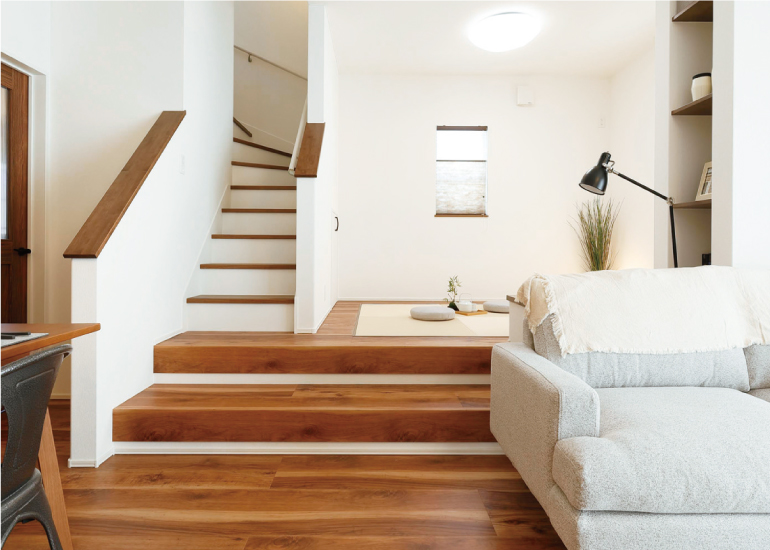 階段の踊り場空間を活かした、小上がりのスペース。堀机で勉強や読書、作業をしながら、リビングにいる家族とのコミュニケーションも楽しめます。/PLAN 4