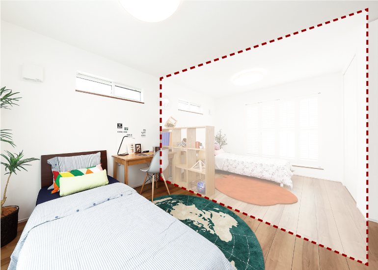 間仕切り壁を追加して子どもの個室を確保。壁を削除すれば広々とした居室にもできる洋室。家族の人数やライフスタイルの変化にも対応します。/PLAN 2・4・6 ※別途有償対応
