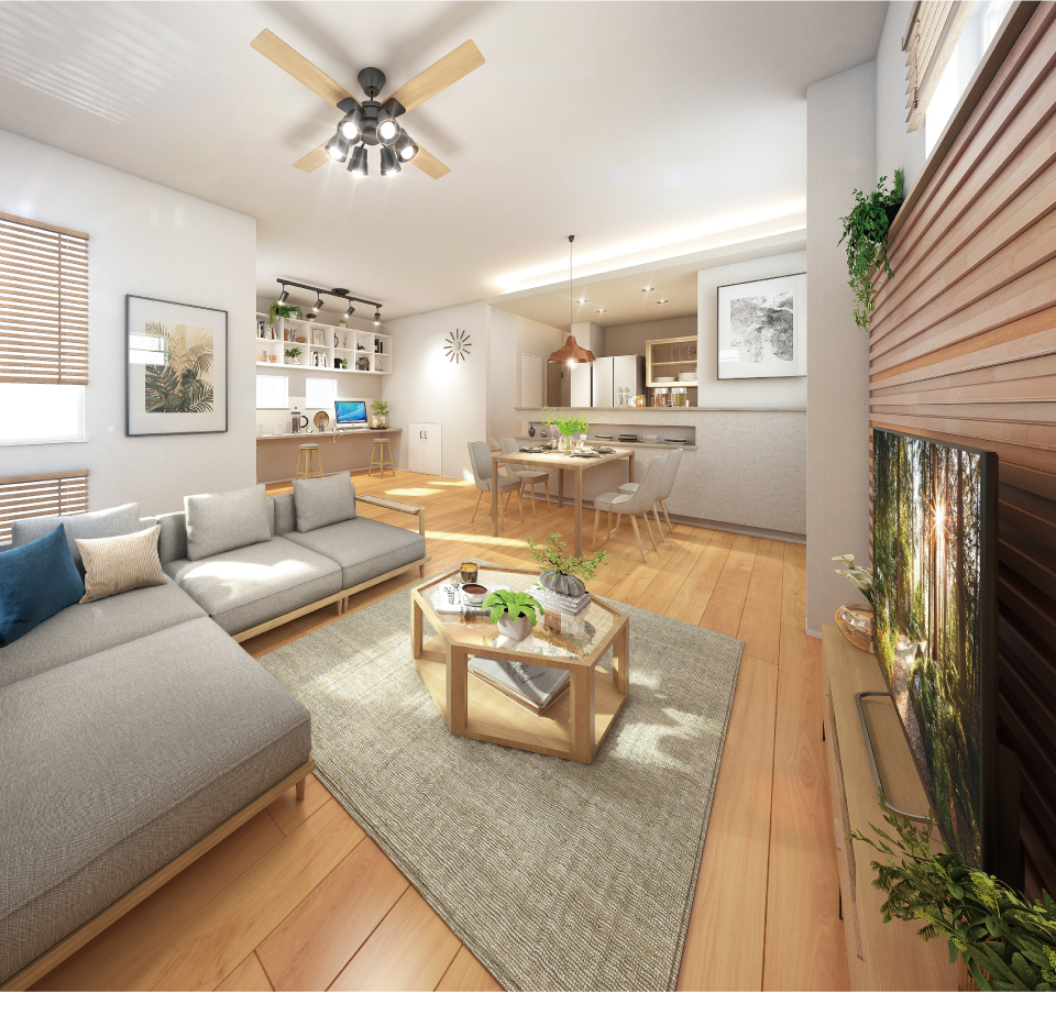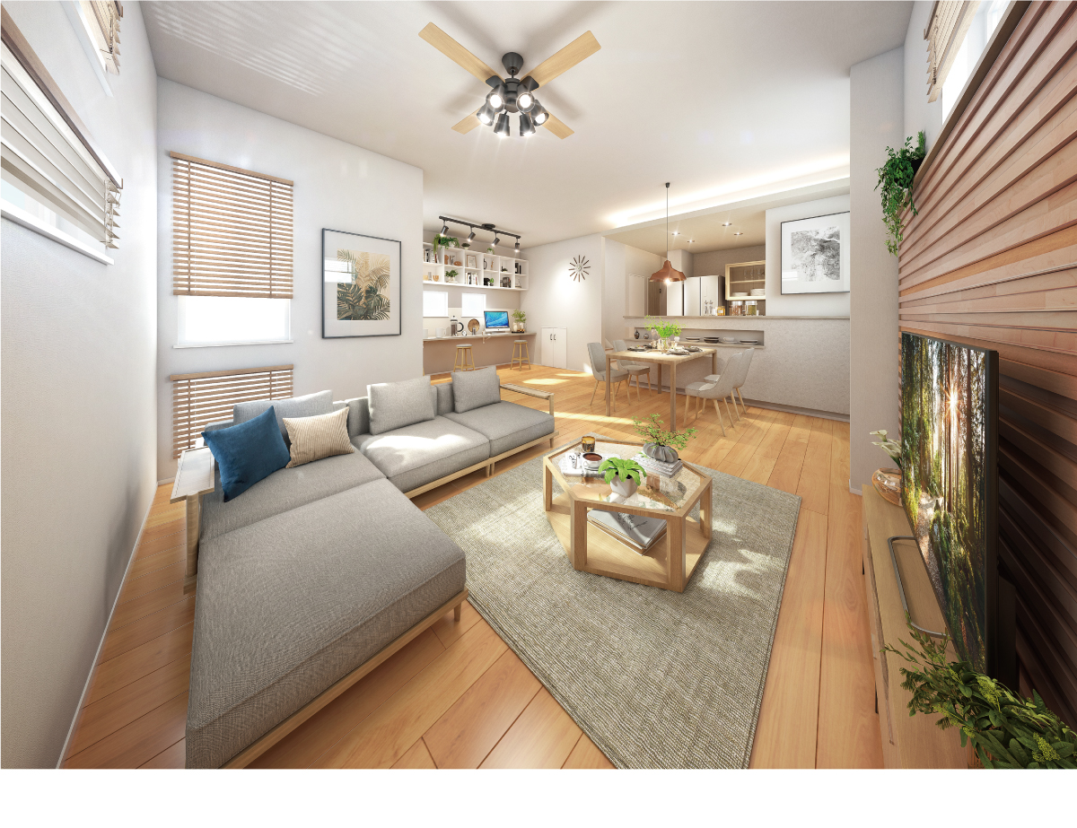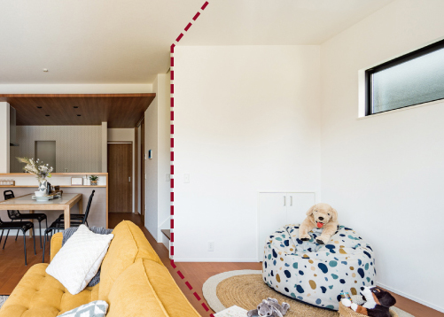 間仕切り壁を追加することでリビングの一部を独立した居室にできるプラン。客間や作業の場などライフスタイルに合わせて様々な使い方を楽しめます。/PLAN 2 ※別途有償対応