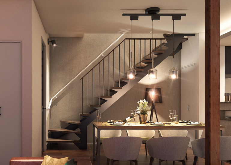 階段下の空間を有効活用でき、開放感が生まれる鉄骨階段。上質さと洗練さを纏った階段が、家族が集うリビングをモダンな空間に演出します。/PLAN 5