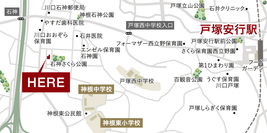 商業施設や子育てのための施設、さらに緑あふれる公園などが豊富に点在し、暮らしの利便もゆとりも味わえる「戸塚安行」エリア。「戸塚安行」駅前をはじめとした広い範囲で区画整理が進められており、未来に渡って快適な環境で、心地よい暮らしを満喫できます。イイナパーク川口 (1,090m/車6分※実測)