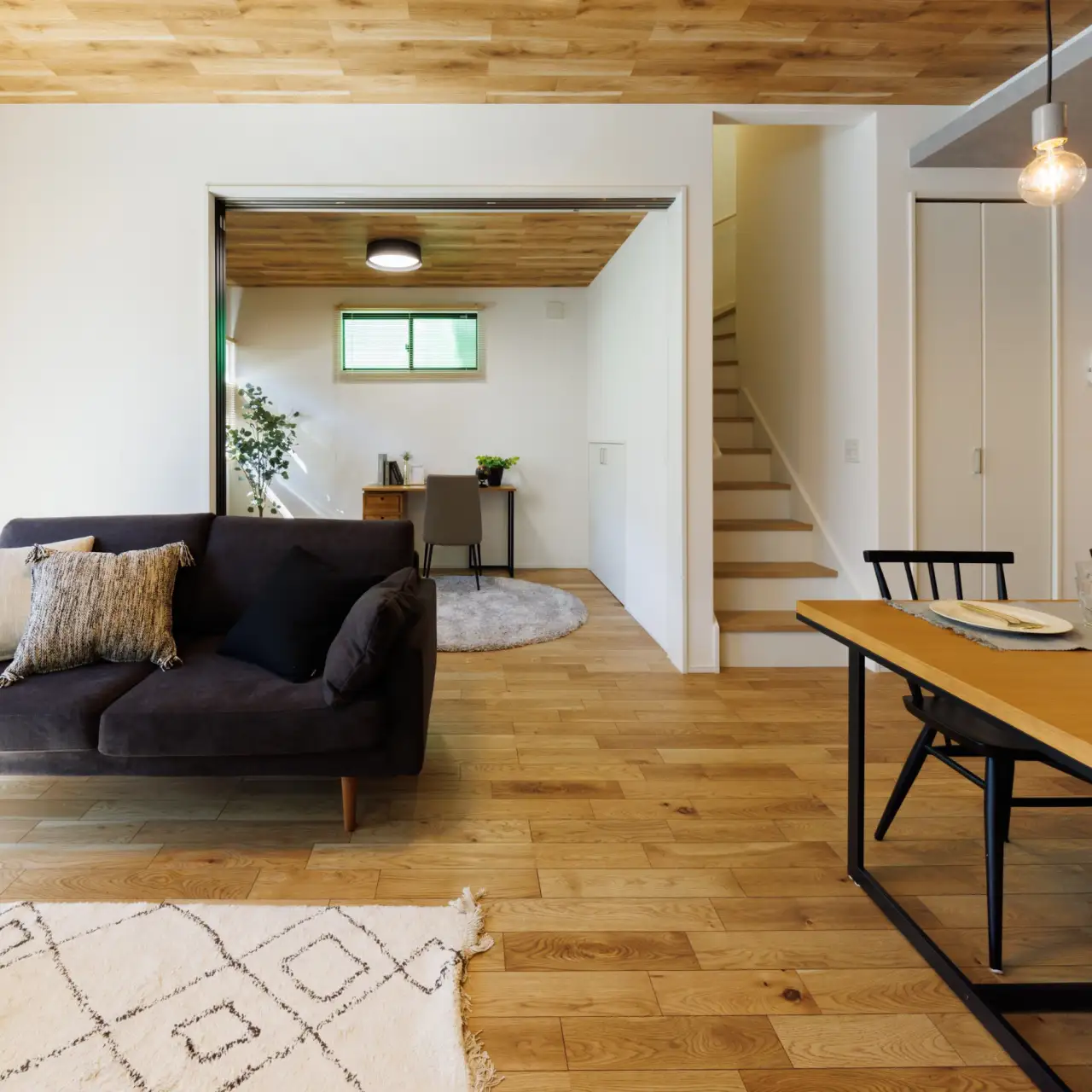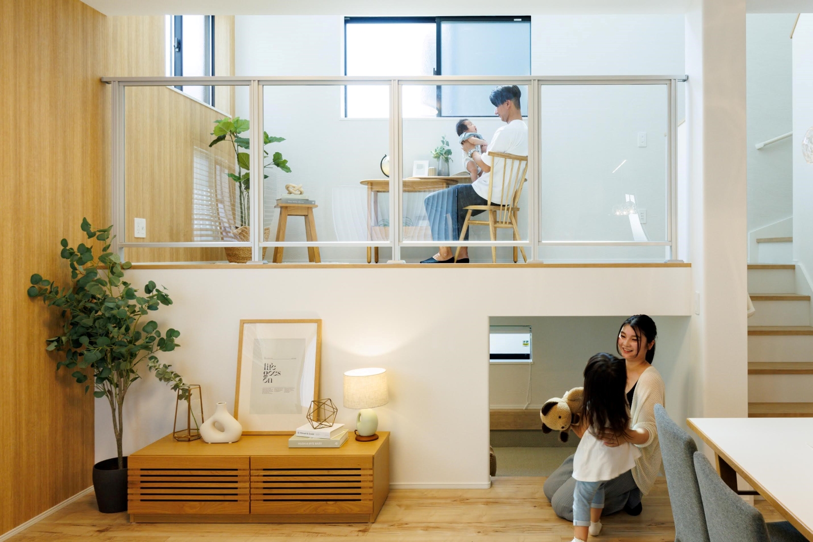 天井の高さ、標準装備の間接照明、収納スペースの豊富さ、キッチンから洗面室、浴室へ回遊できる動線など、自分たちで手を加えなくても完成されたデザイン性の高さ、そして生活に寄り添った設備は、価格以上の価値があると感じました。また、キッチンから子どもの様子を見渡せる「小上がりスペース」があり、リビングとは別に子どもの遊び場が欲しいと思っていた私たちにとって、まさに理想の間取り。