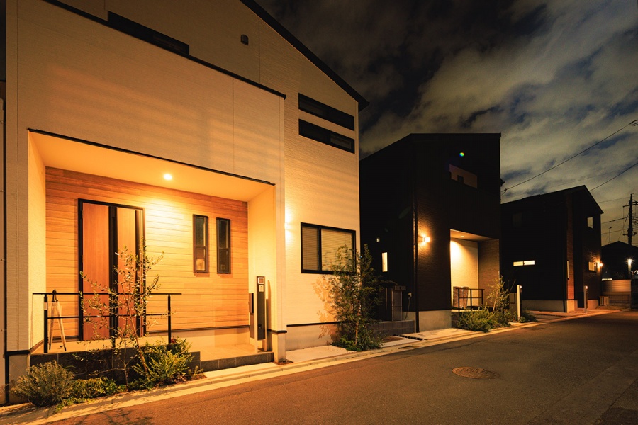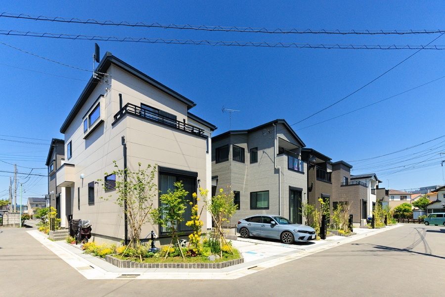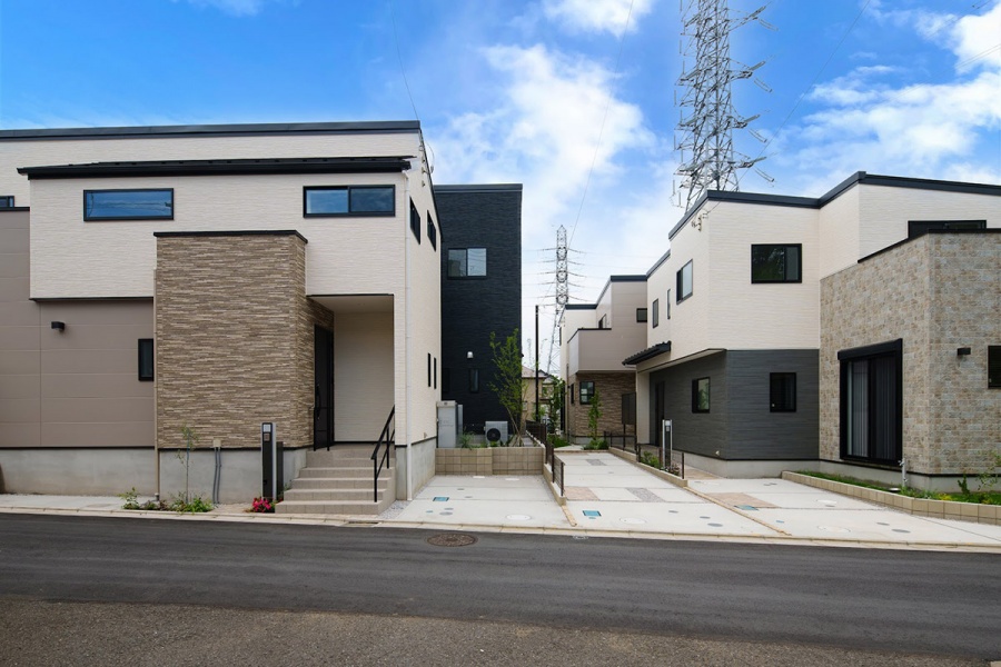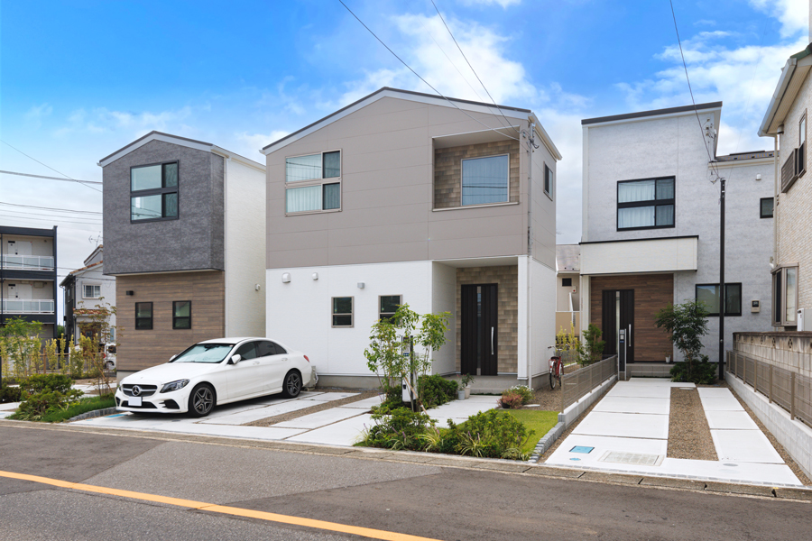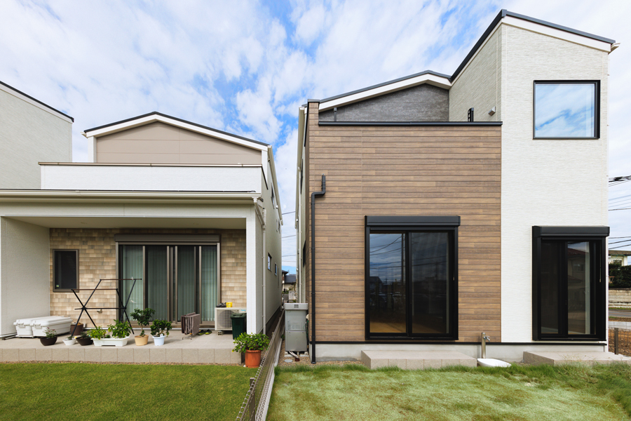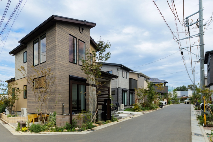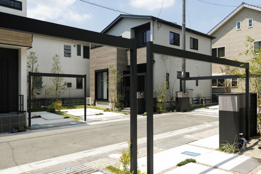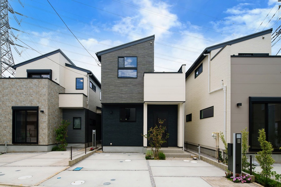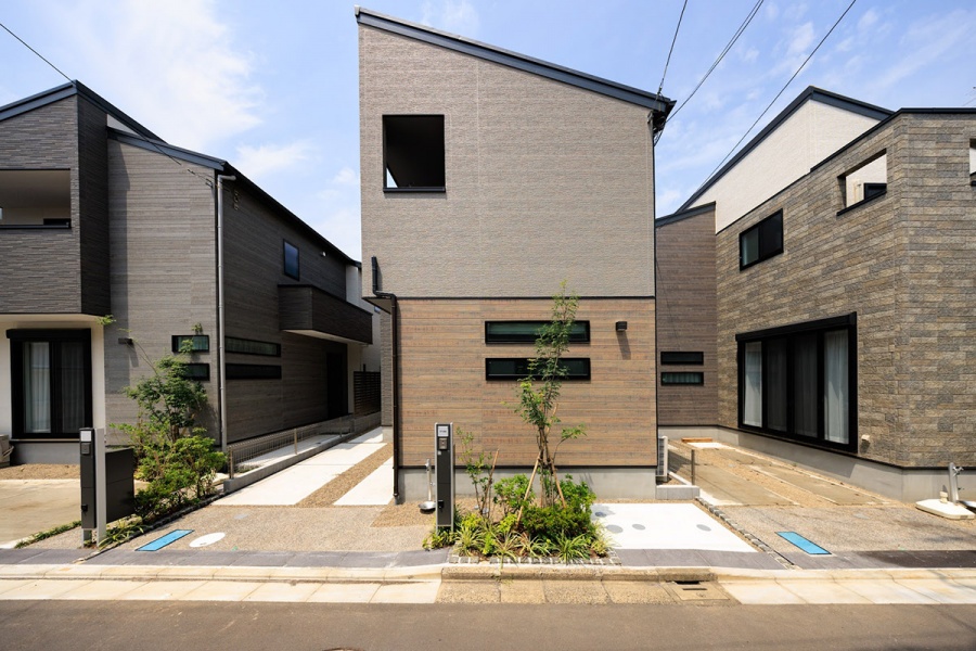 切妻屋根が印象的なモダンデザインの住まいには、青空とのコントラストを意識した落ち着いたサイディングを採用。家族が過ごす毎日にも心地よさをもたらす、そんな街並みを描いています。