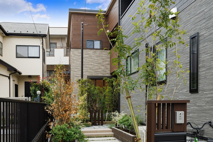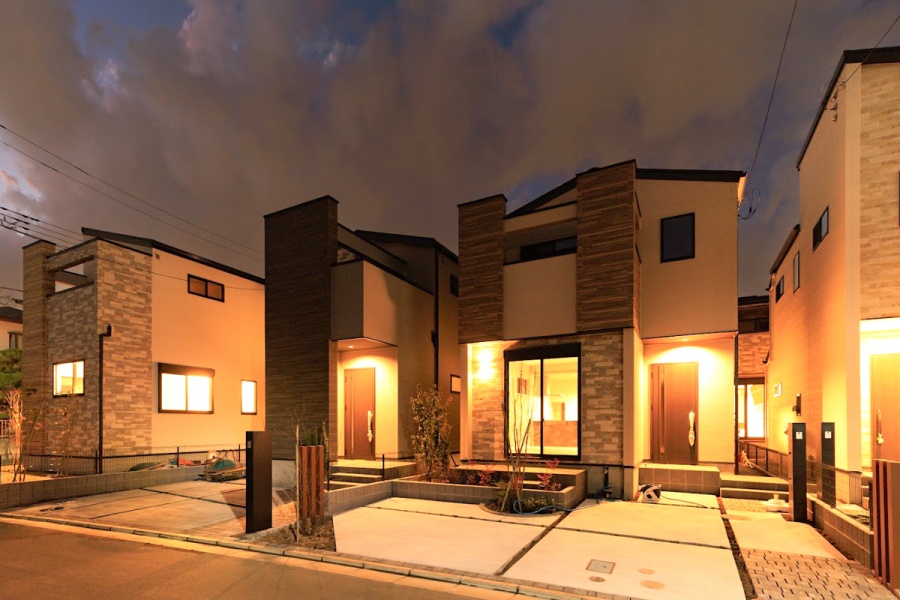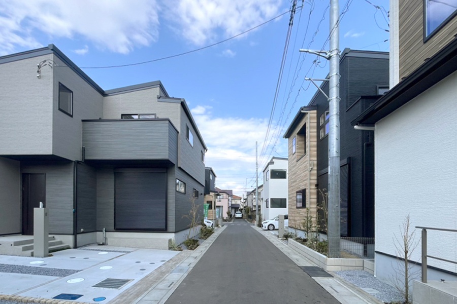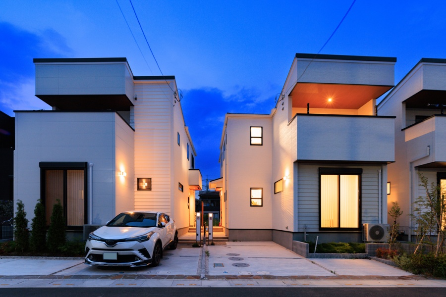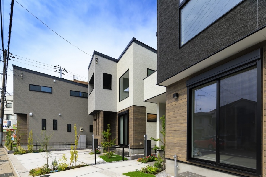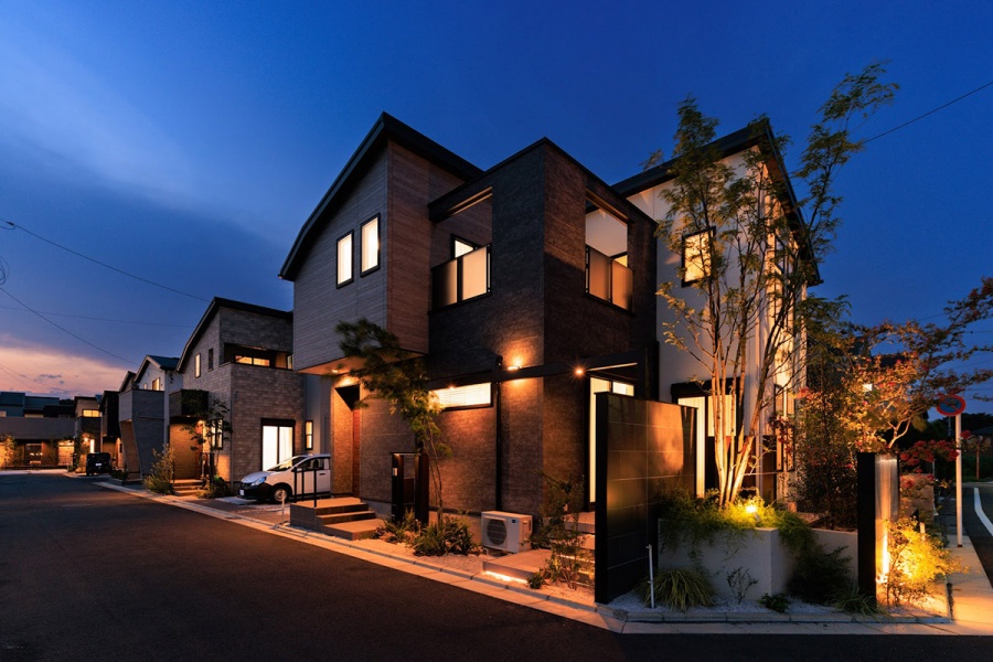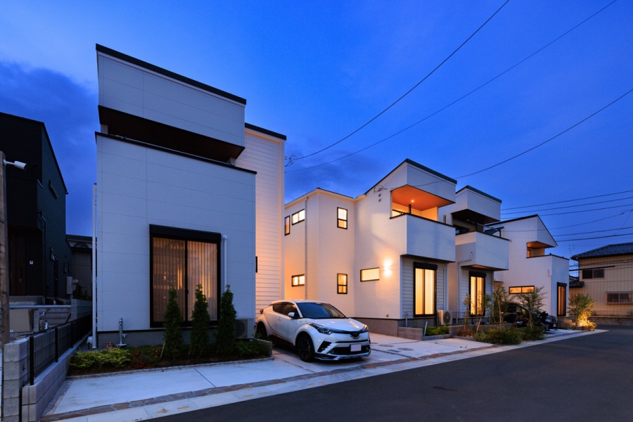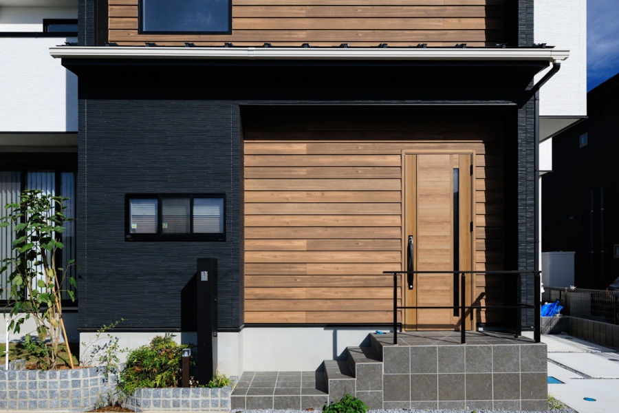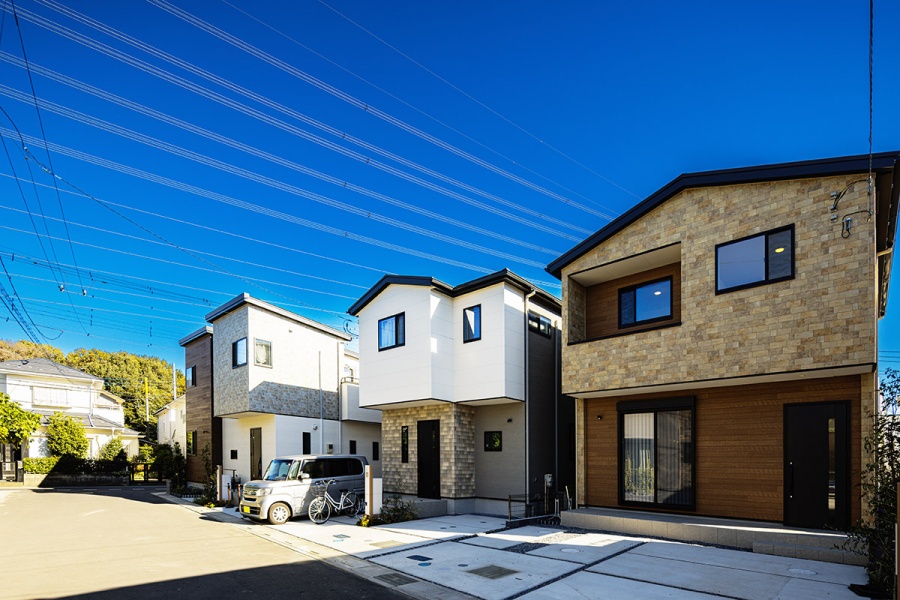 切妻屋根が印象的なモダンデザインの住まいには、青空とのコントラストを意識した落ち着いたサイディングを採用。家族が過ごす毎日にも心地よさをもたらす、そんな街並みを描いています。