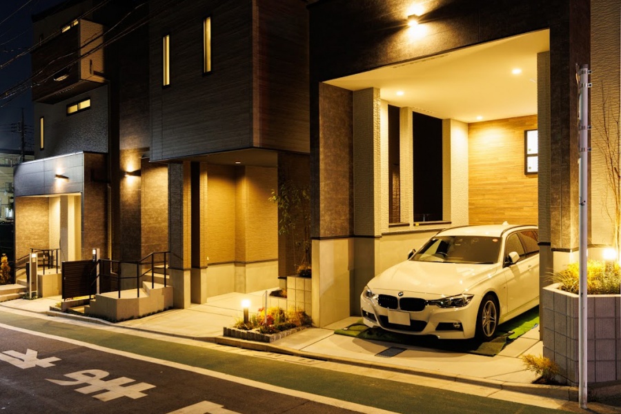 南側道路面から陽光がたっぷりと降りそそぐ、心地いい立地。モノトーンと木目調の外壁が、彩り豊かな植栽と調和してモダンリゾートな雰囲気を醸し出す、憩いの邸を描きました。