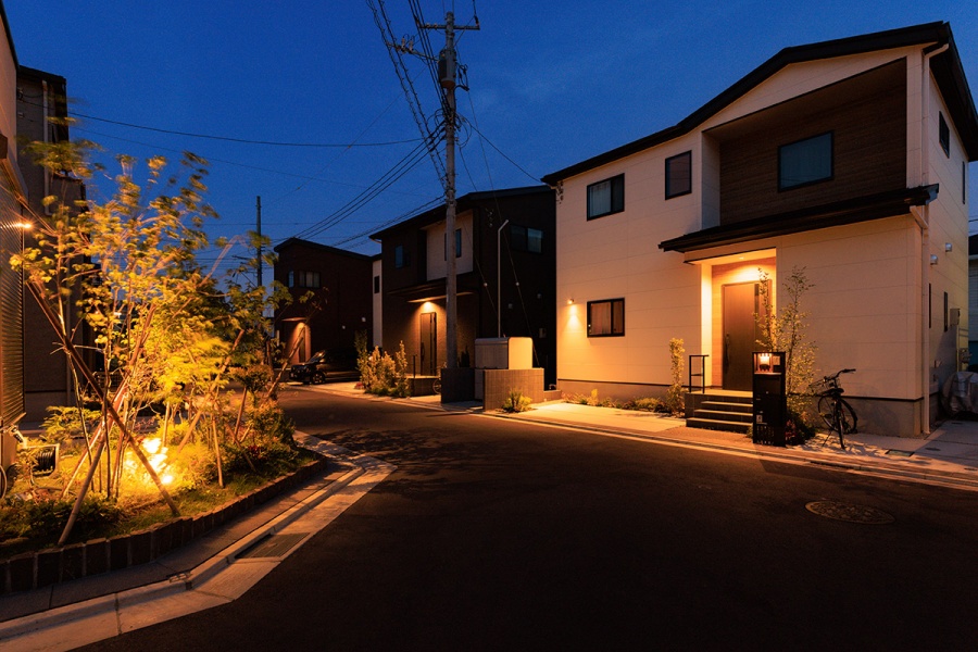 モノトーンの鮮明なコントラスト。多彩なルーフスタイルが生み出す動き。さらに木目調のアクセントサイディングによる味わいや、植栽の緑の潤い、ふりそそぐ陽光のあたたかさなど、自然の豊かさがスタイリッシュな情景のアクセントとなり、上質な街並みを創出します。