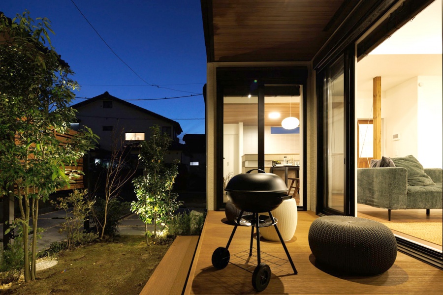 リビングの掃き出し窓の外にテラスを設け、団らんの場と伸びやかな庭を融和させる中間領域としました。内と庭との境界が曖昧になることで、あたたかな陽光や爽やかな風、季節の移り変わりや心地よい開放感をより気軽に味わえるように。また、イスやテーブルとセットすれば、庭で遊ぶ子どもやペットを見守りながら、読書やティータイムを楽しむアウトドアリビングとしても活用できます。