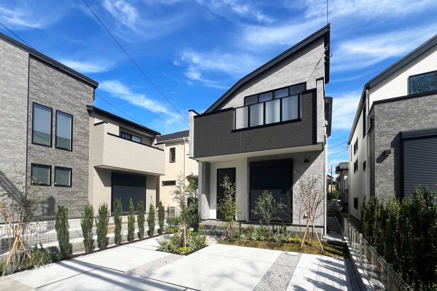 全邸130㎡以上のゆとりと開放感を携えた、落ち着きのあるグレーベースの邸宅。植栽や近隣の緑の華やかさとのコントラストが美しい住まう家族に相応しい寛ぎの街並みを描きました。