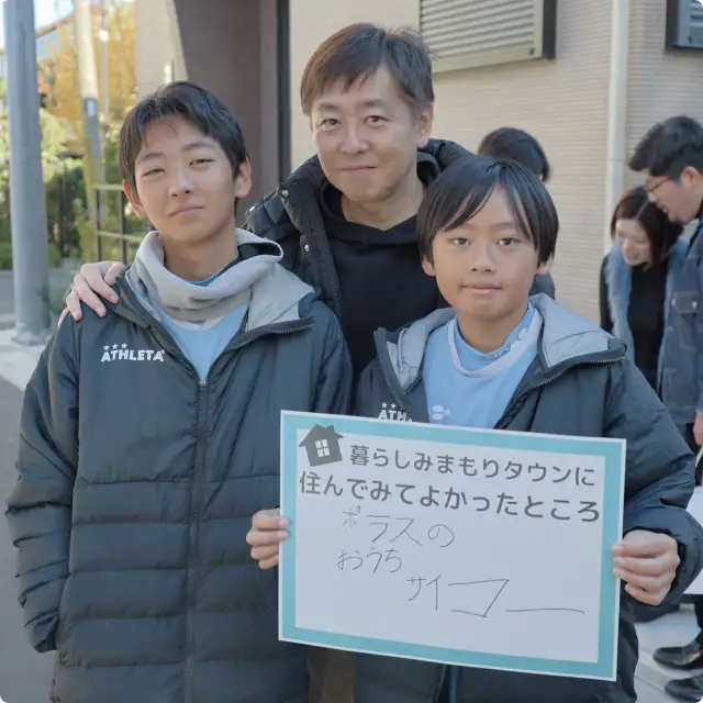 家族の安心を見守る防犯カメラや、快適な暮らしを包み込む街区内道路、みんなが集うつむぎテラスや公園など、家族や住人同士で絆を育む居場所や様々な工夫を街全体にちりばめました。