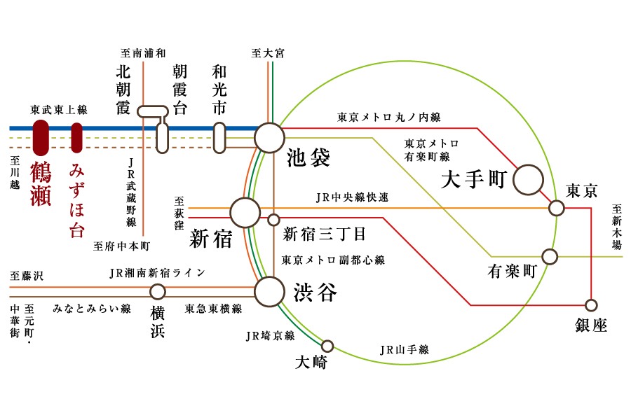 - 東武東上線 「鶴瀬」駅より ●「池袋」駅まで…33分 /東武東上線利用「和光市」駅で東京メトロ副都心線通勤急行に乗り換え ●「新宿」駅まで…44分 /東武東上線利用「和光市」駅で東京メトロ副都心線通勤急行に乗り換え「新宿三丁目」駅で東京メトロ丸ノ内線に乗り換え ●「渋谷」駅まで…46分 /東武東上線利用「和光市」駅で東京メトロ副都心線通勤急行に乗り換え ●「大手町」駅まで…52分 /東武東上線利用「和光市」駅で東京メトロ副都心線通勤急行に乗り換え「池袋」駅で東京メトロ丸ノ内線に乗り換え ※表示の分数は朝のラッシュ時の所要時間です。乗り換えの待ち時間を含みます。また、時間帯により異なります。