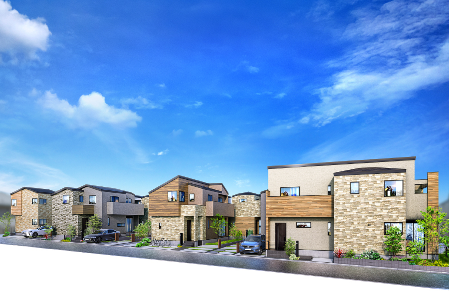 - ぬくもりのある色合いの外壁を基調に、木目調と石目調をアクセントに配した、豊かな表情の街並み。住まうほどに愛着が深まる、心満たされる景観を創出しています。 ※街並み完成予想図