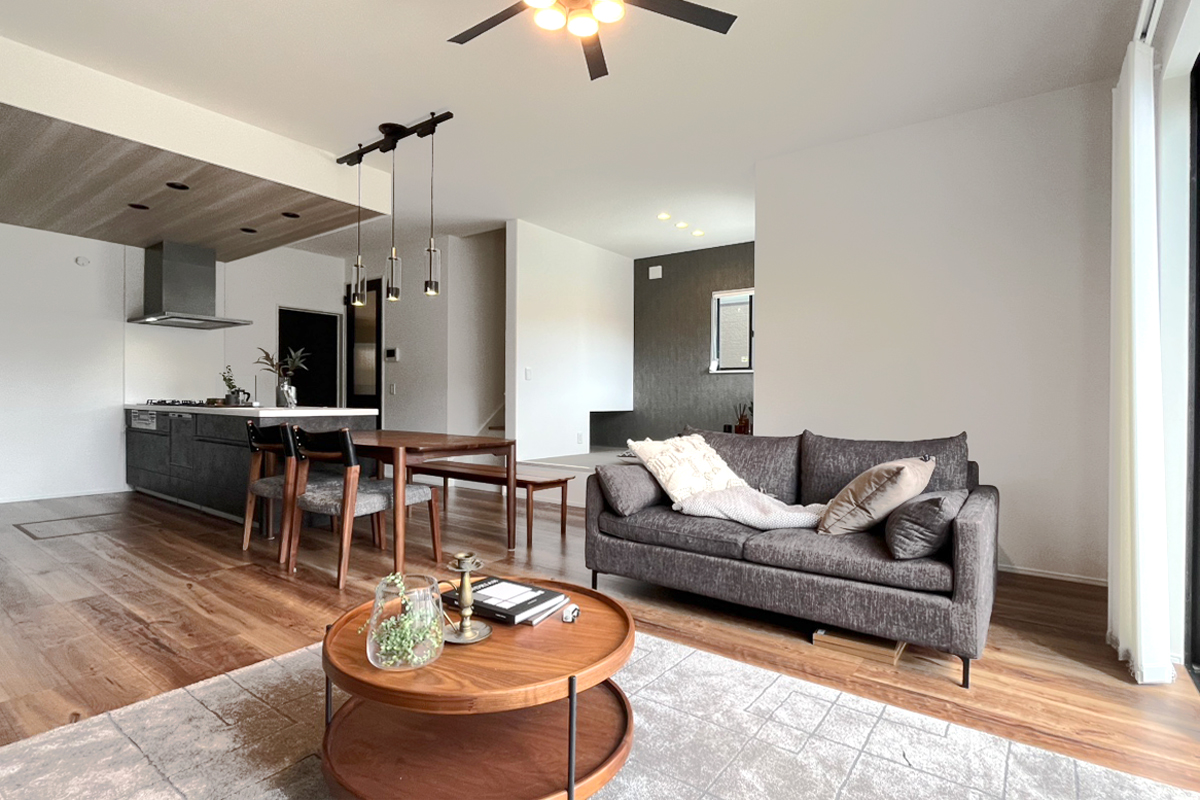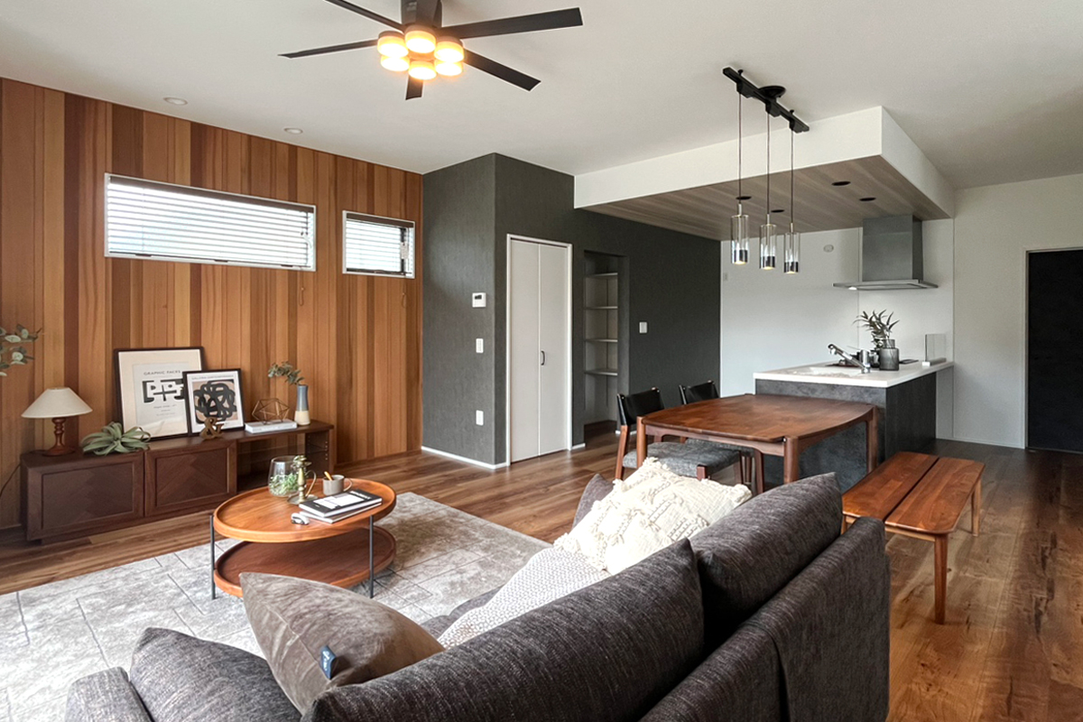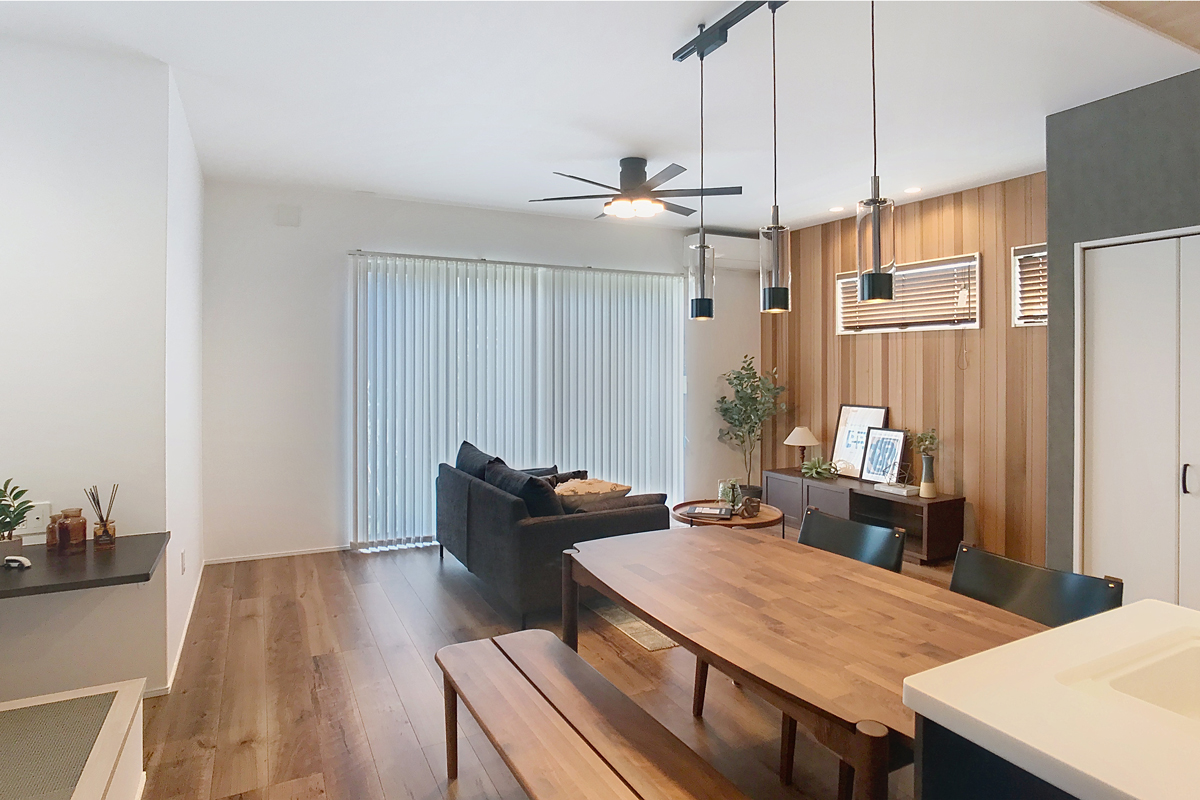 - 【アートのように映えるアクセントパネル】 リビングにアクセントパネル(ランダムビッチ)を取り入れることで、視覚的に動きが生まれ、壁全体がまるでアートのような印象になります。 /1号棟※2025年9月撮影