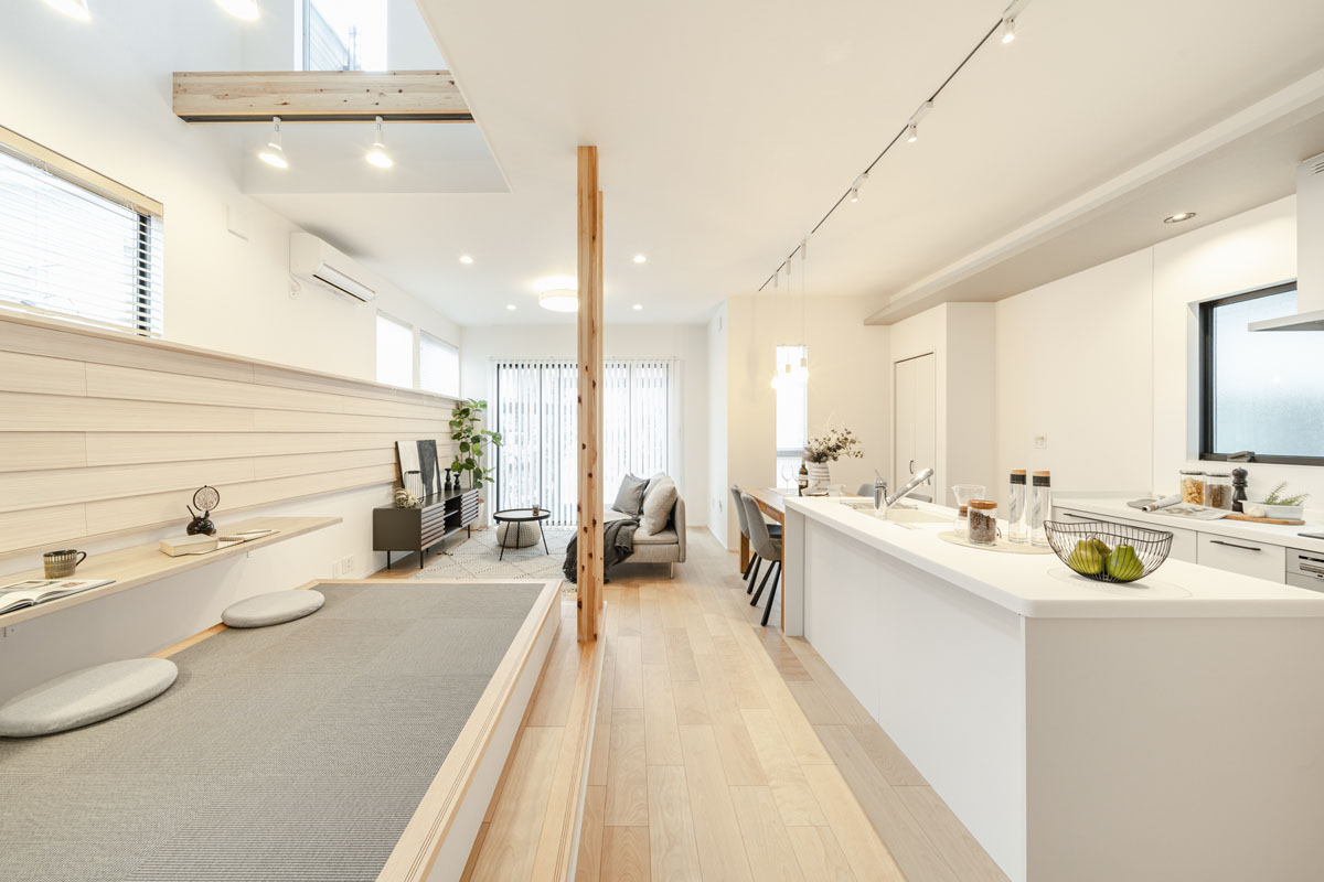 - 階段から2段上がった小上り空間。堀机を備えているので。足を伸ばしながらテレワークやリビング学習など、子どもから大人まで家族と程よい距離感で思い思いに過ごせます。※4-1号棟/2025年7月撮影