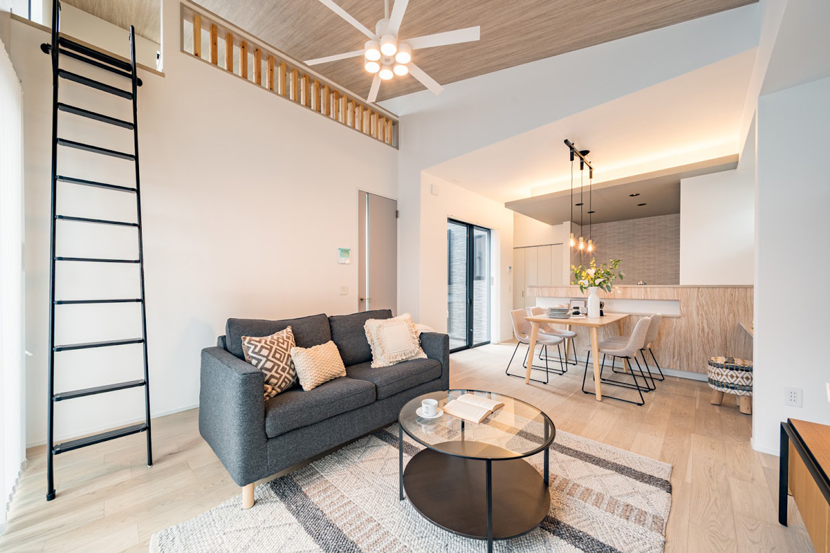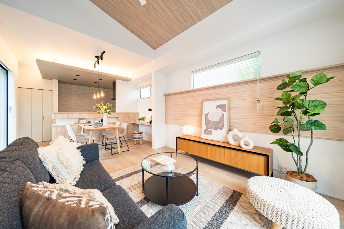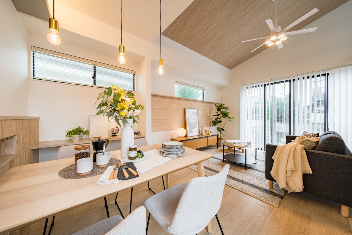 - 【開放感あふれるリビング】 団らんの中心となるLDKにたっぷりの広さを確保し、開放感あふれる空間を描きました。家族が集まってもゆとりを感じながら団らんを楽しめます。※2号棟/2025年8月撮影