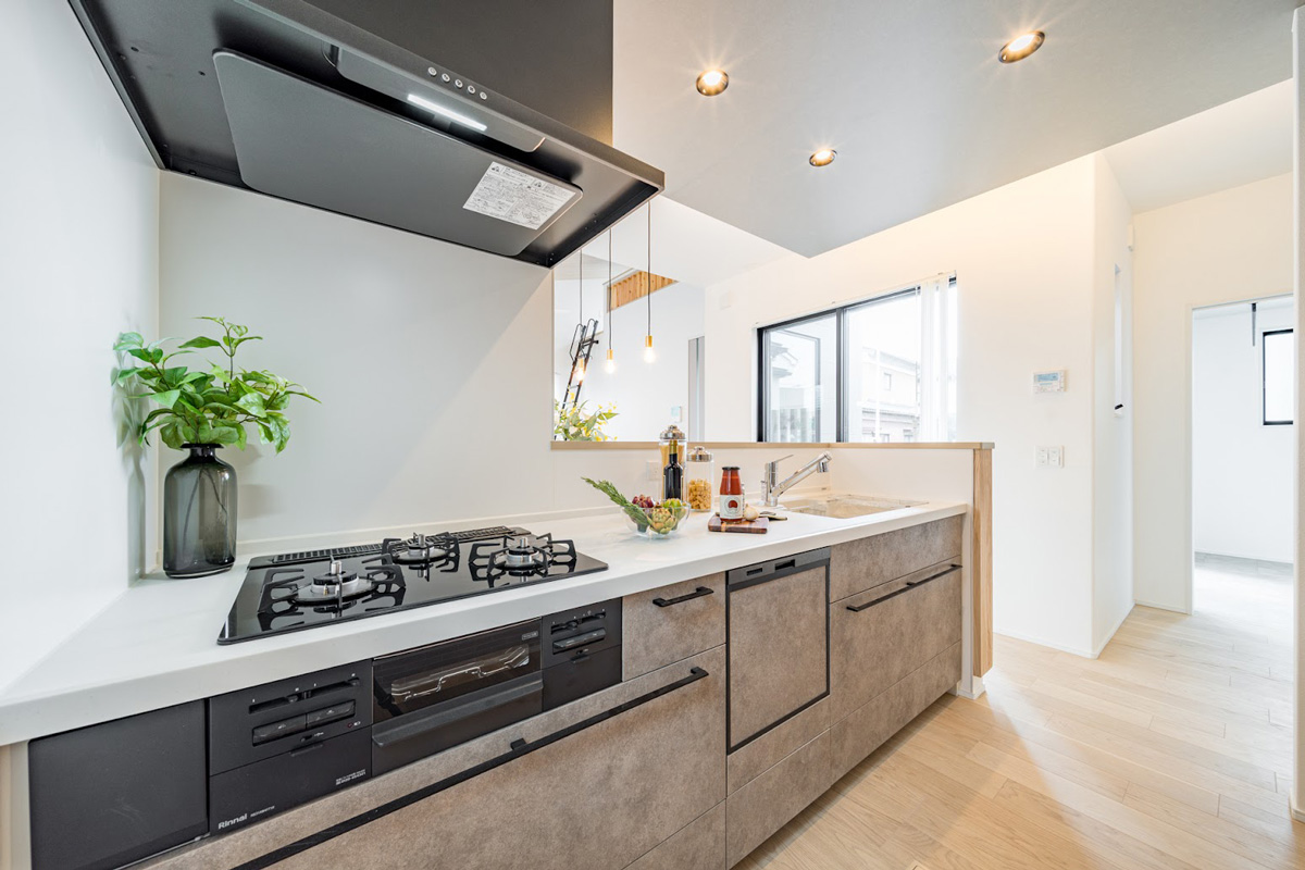 - 【明るく心地のよいキッチン】 テラスのある窓から心地よい陽光が室内へ注ぎます。ダイニング側のニッチに小物などを飾ることでインテリアのアクセントになります。※2号棟/2025年8月撮影