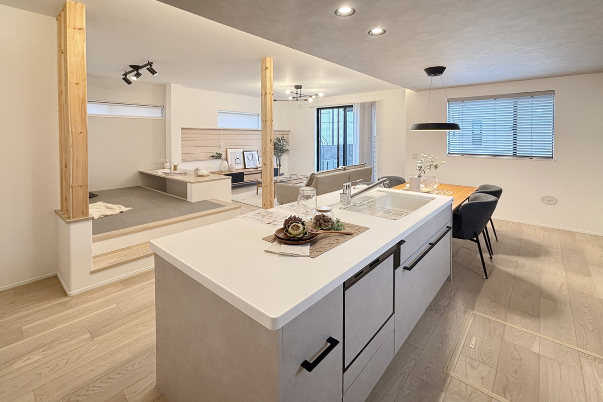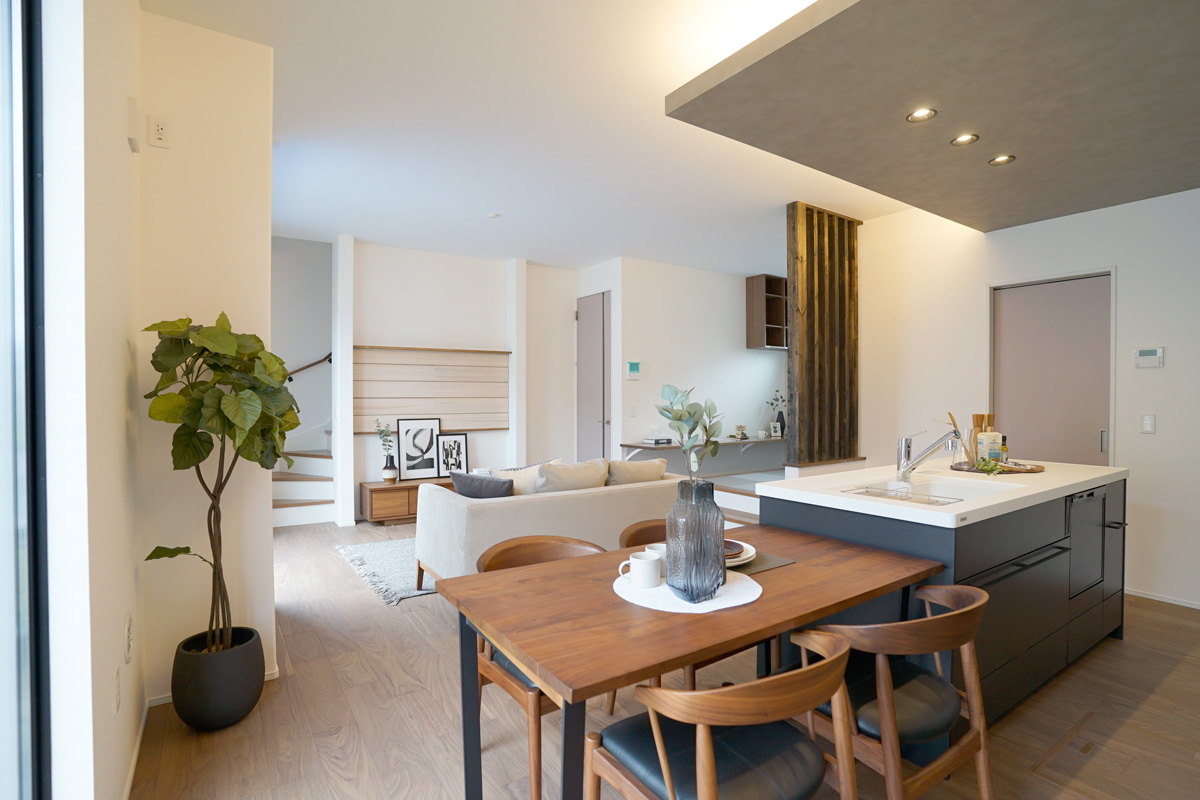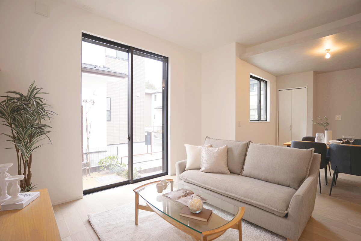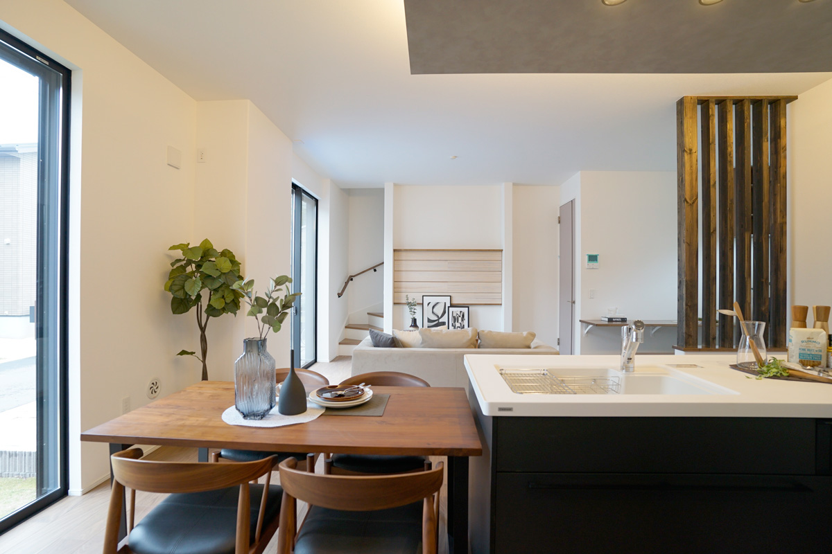 - ダイニングからは、LDKと、その先に広がるプライベートガーデンを一望できます 。ワイド&ハイサッシから差し込む陽光が、家族で過ごす空間を明るく彩ります 。※9号棟/2026年3月撮影