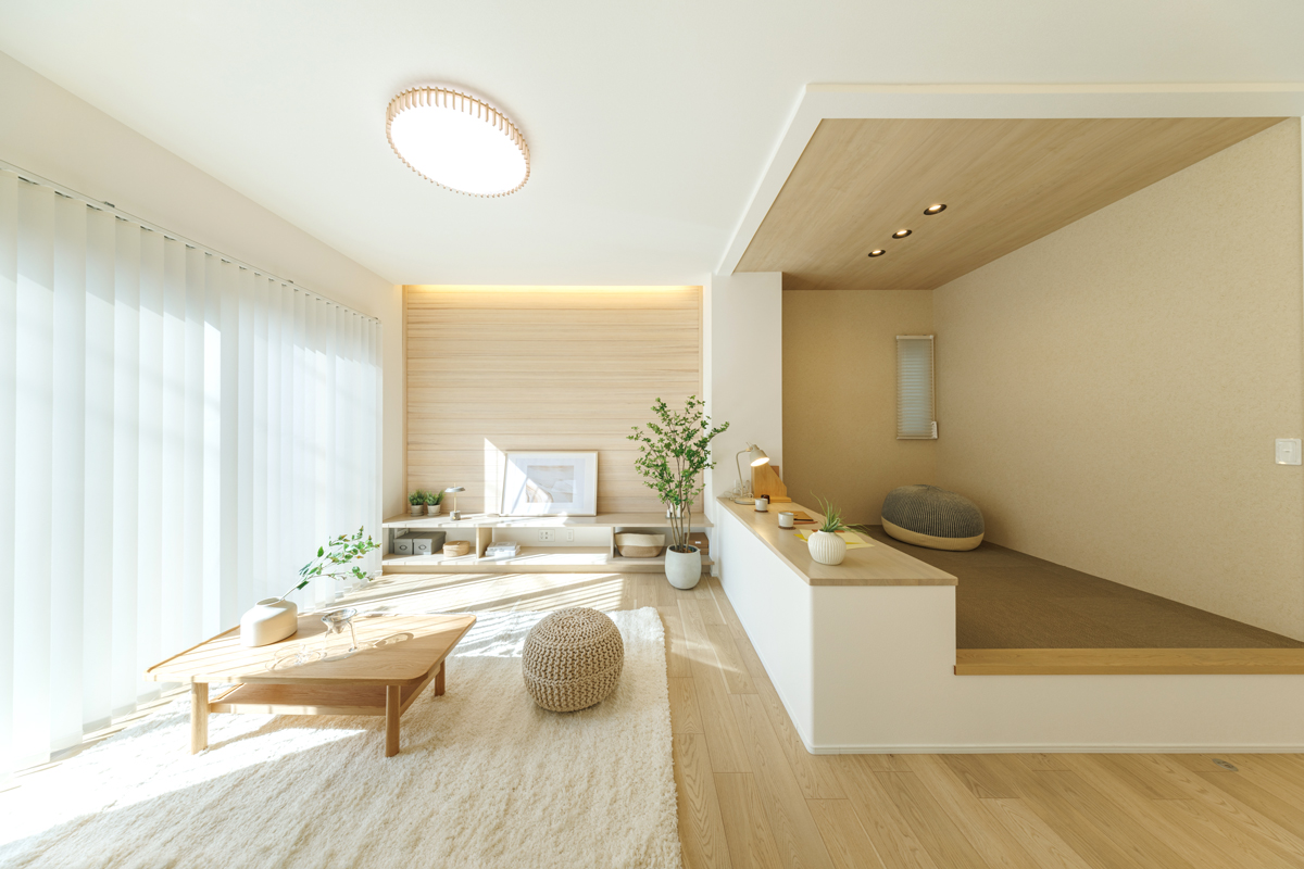 - 腰掛けるのにちょうど良い高さの小上り空間。テキスタイルフロア敷なので横になったり、堀机で脚を伸ばしながらリビング学習など子どもも大人も思い思いの使い方で自由に過ごせます。※3号棟/2026年1月撮影