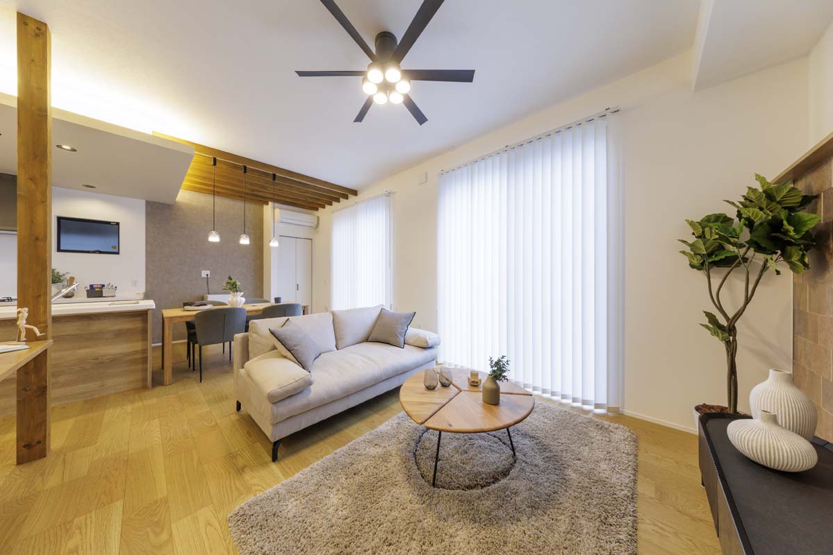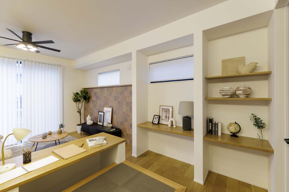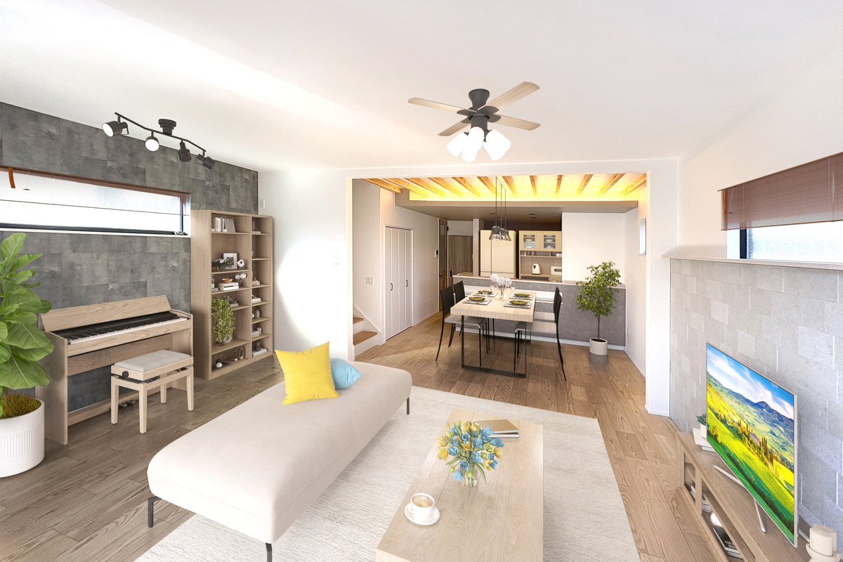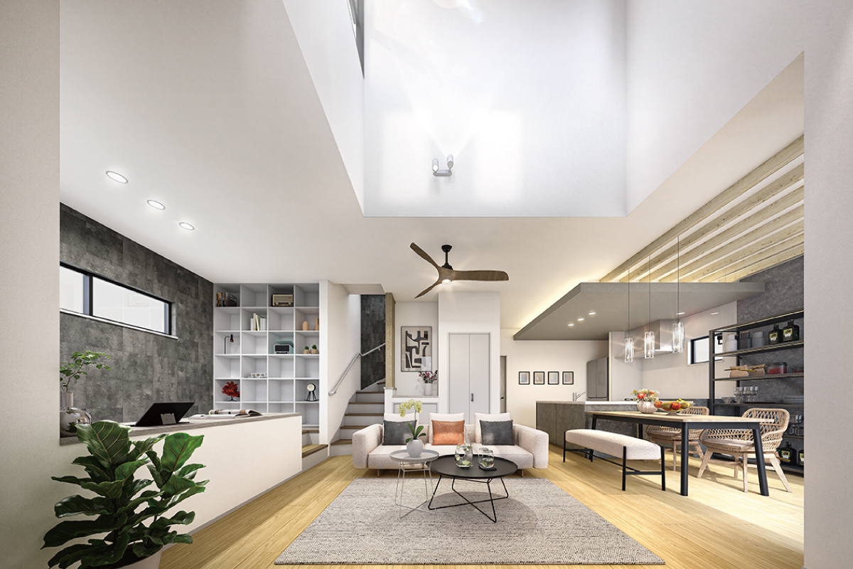 - 洗練された寛ぎを演出する石目調、ナチュラルな温もりが包み込む木目調という住まう人の憧れる空間への想いを受け止める2つの素材を天井や壁面に設えました。建具や玄関手すりもそれぞれの質感に合うものを厳選し、きめ細やかに装っています。※77-1号棟完成予想図