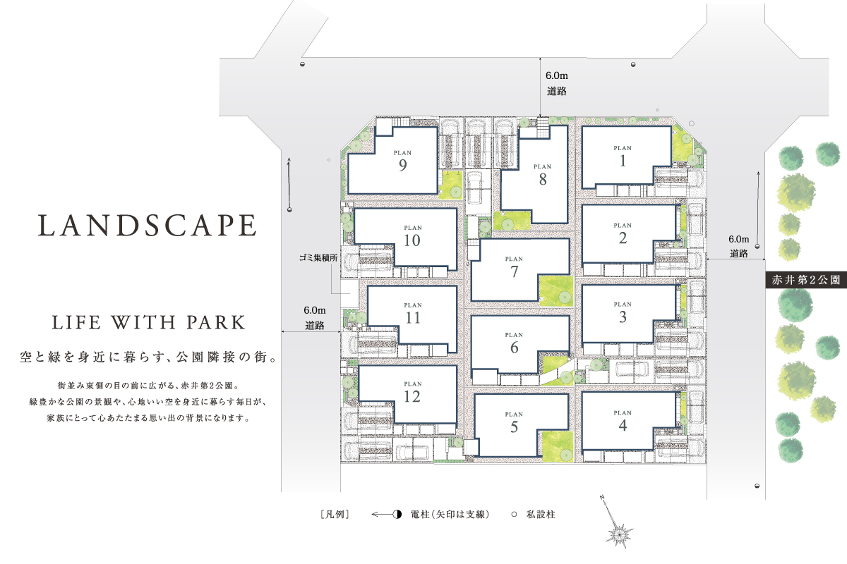 - 公園の緑を借景とする、木目調に憩う全12邸。 四季折々の赤井第2公園の緑景に憩う立地。街区内道路の陽だまり、四季折々の空の景観に包まれる、心地いい暮らしを描く全12邸の街。住まう人の交流を育む、心あたたまる住まいを創出しました。