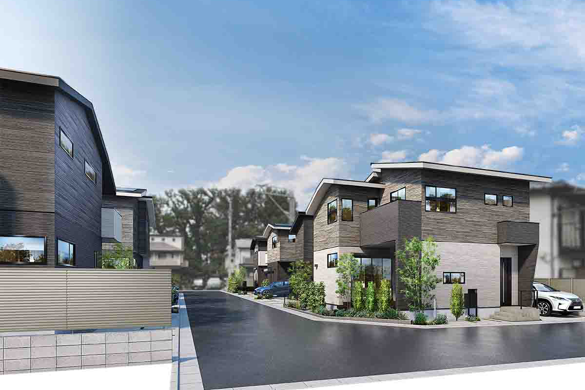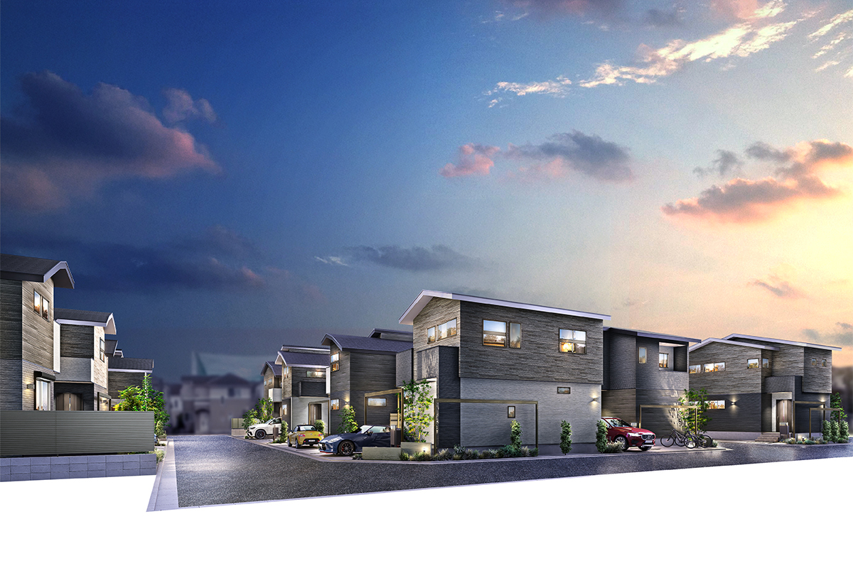 - 全邸太陽光発電システム標準装備。カースペース2台設定※号棟により異なります。 アースカラー包まれる落ち着いた全12邸の街。