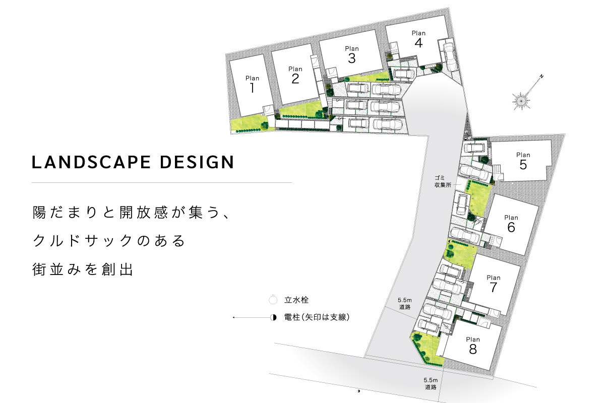 - 全8区画の新たなコミュニティが誕生します。 街区内には、通過交通のない「クルドサック(袋小路)」状の道路を採用。 住人以外の車の進入が少ないため、静穏で安全な住環境が保たれます。 陽光をたっぷり取り込む開放的な配棟計画と、豊かな植栽が彩るランドスケープが、 ここに住まうご家族の心豊かな時間を創出します。
