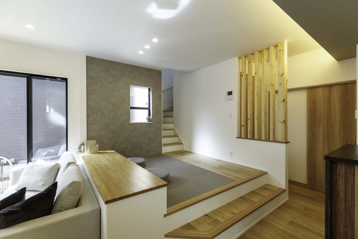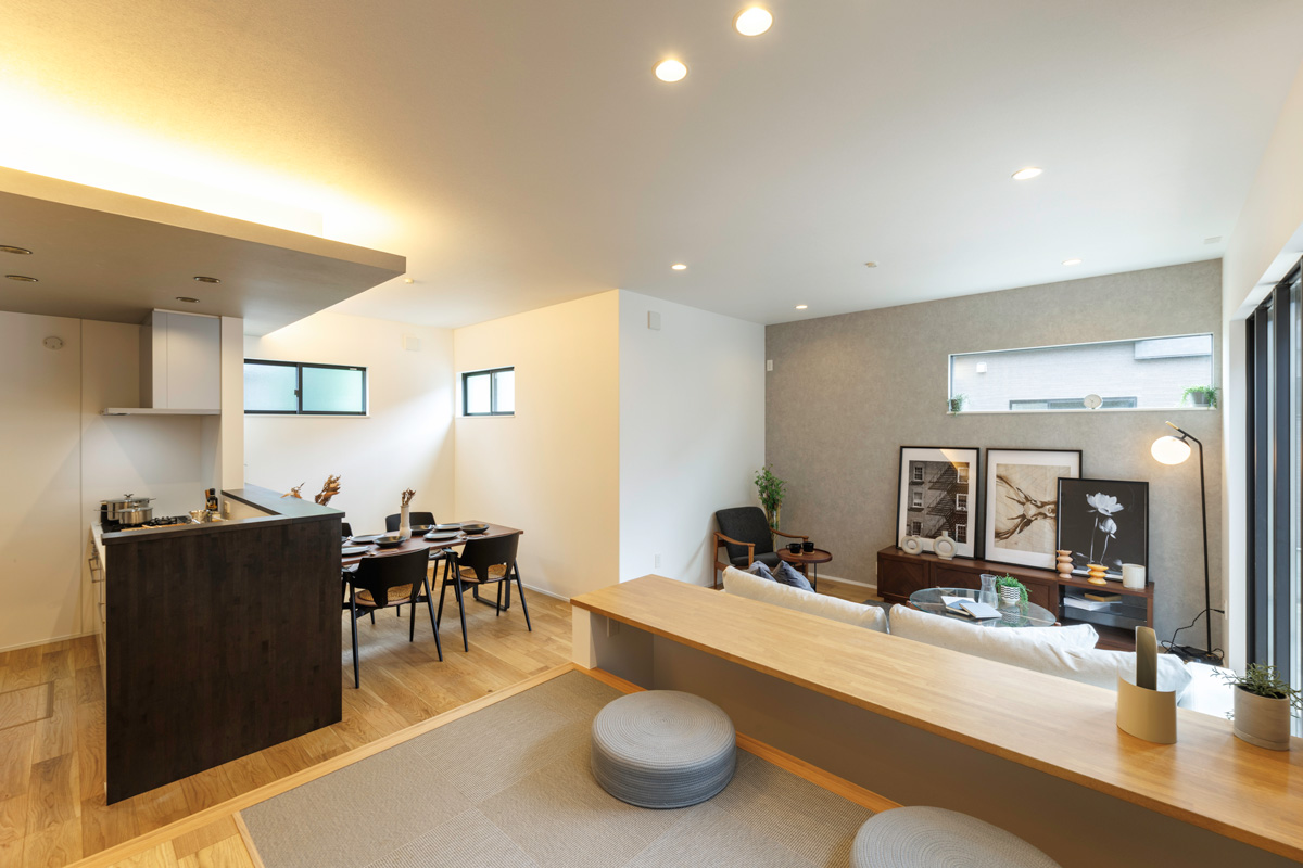 - 会話が弾む対面キッチンと、家族が自然と集まるリビング。段差のある和コーナーは、子どもの遊び場やお昼寝にぴったり。温もりのある木目と光に包まれ、家族の笑顔が広がる住まい。※7号棟/2026年3月撮影
