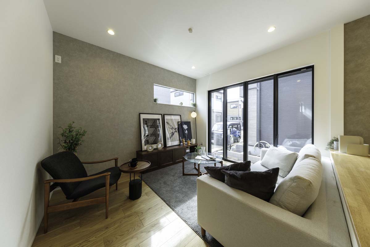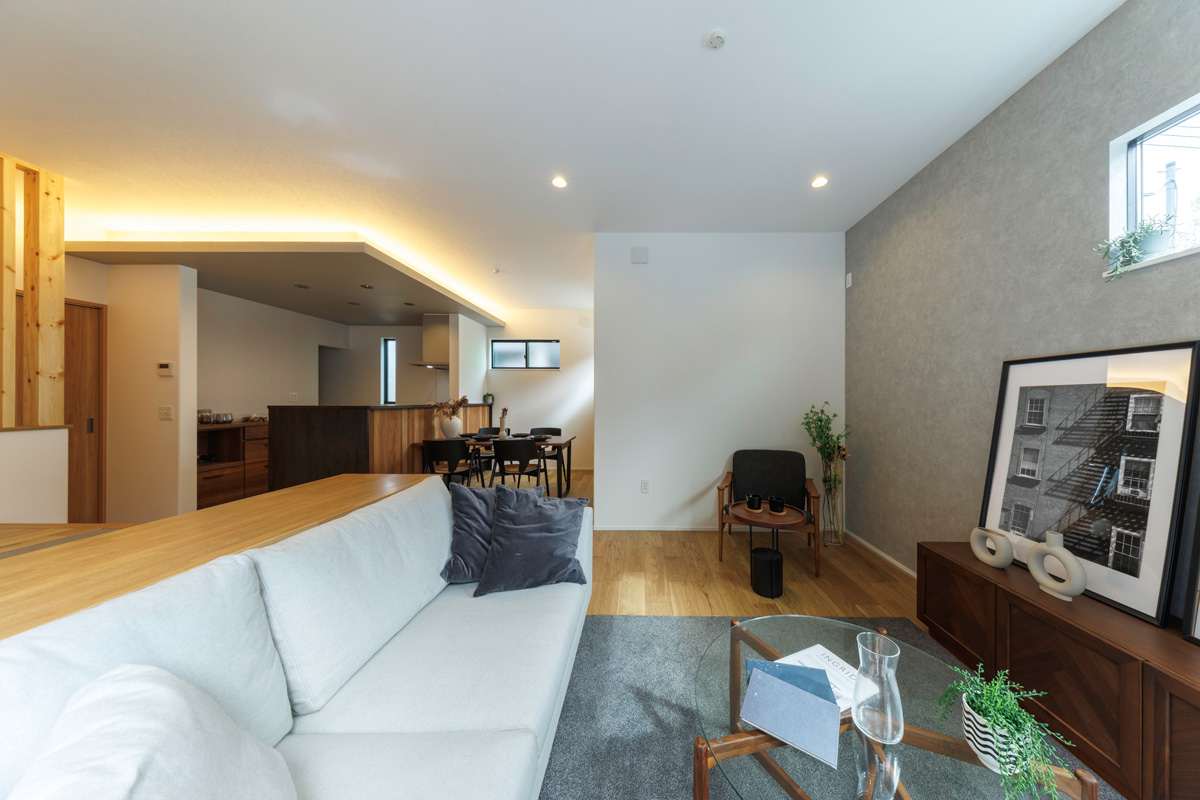- 大きな窓から光が注ぐリビングは、家族の特等席。落ち着いたアクセントパネルと木の温もりが調和し、心地よい団らんを演出します。上質な空間で、家族の思い出を育む住まい。※7号棟/2026年3月撮影