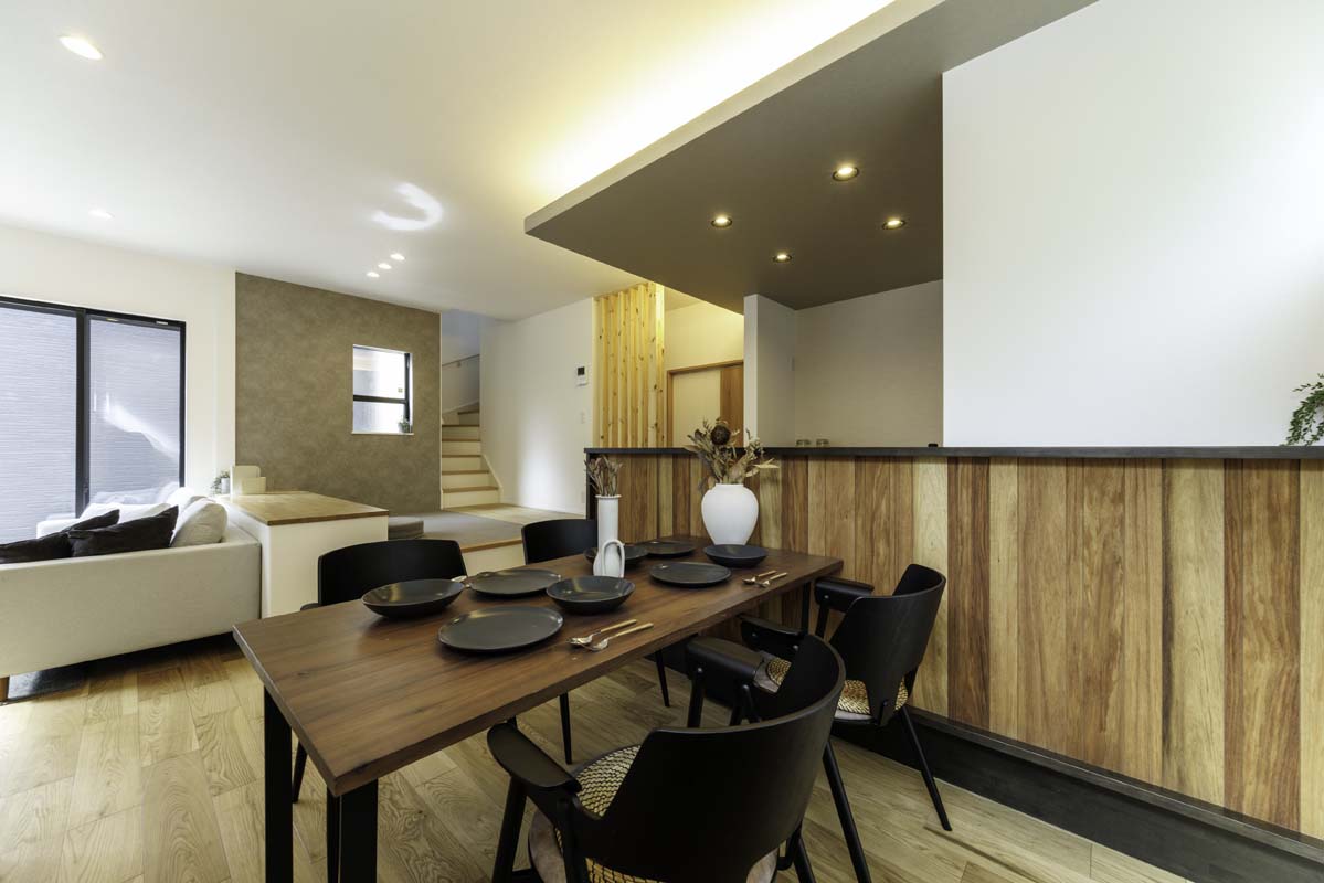 - 料理中も家族の笑顔が見える対面キッチン。木の温もりに包まれたダイニングは、毎日の食事を彩ります。ステアリビングまで見渡せる開放感で、家族の絆が深まる住まいです。※7号棟/2026年3月撮影