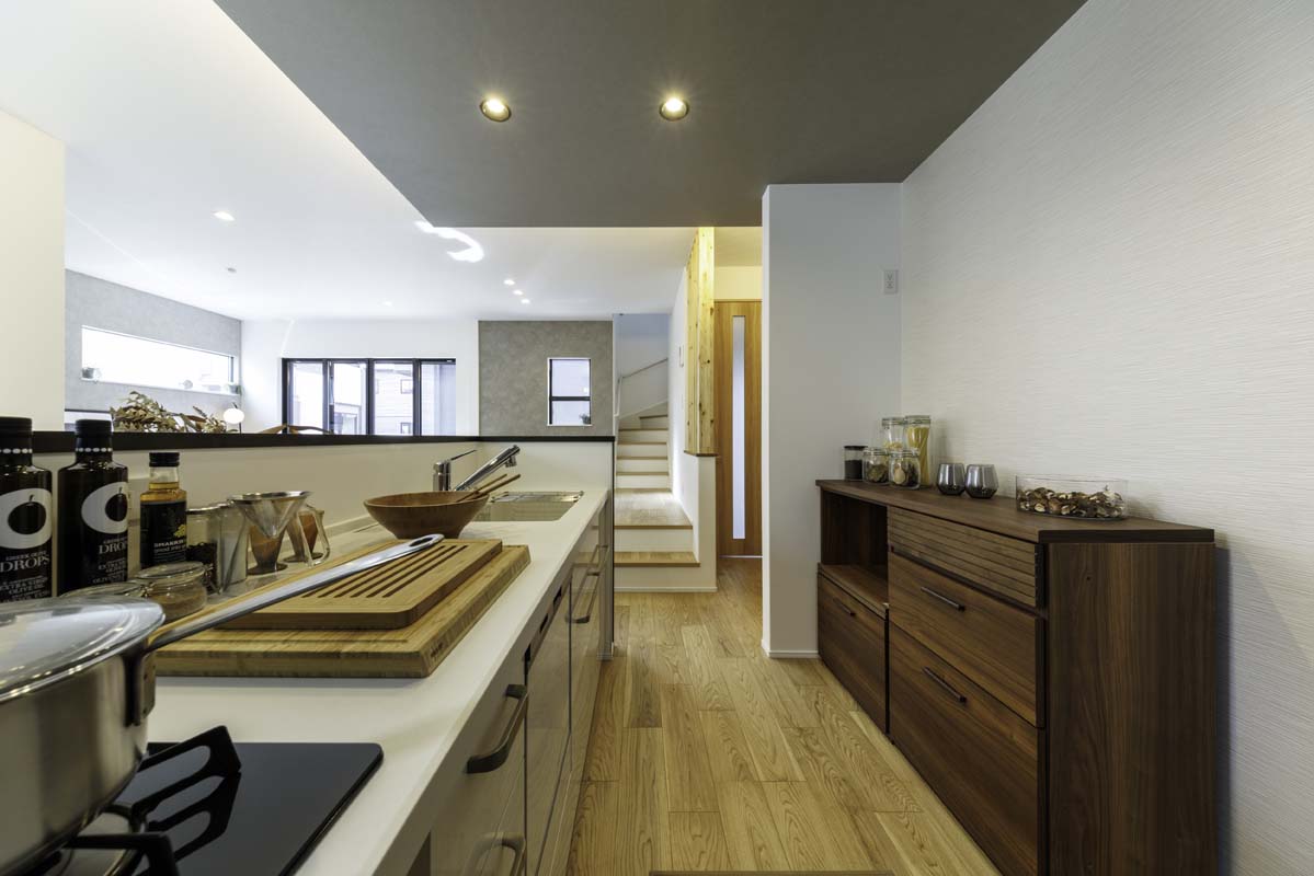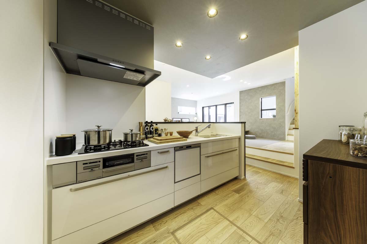 - 料理中もリビングの家族を見守れ、自然と笑顔が集まります。たっぷりの収納と機能的な動線で、忙しい毎日の家事もスムーズに。家族の絆を育む、温もり溢れる住まい。※7号棟/2026年3月撮影