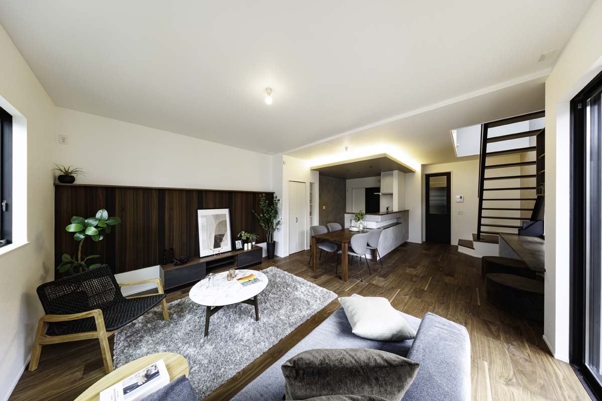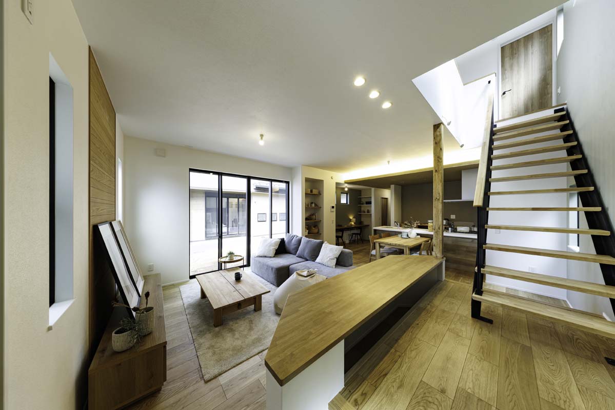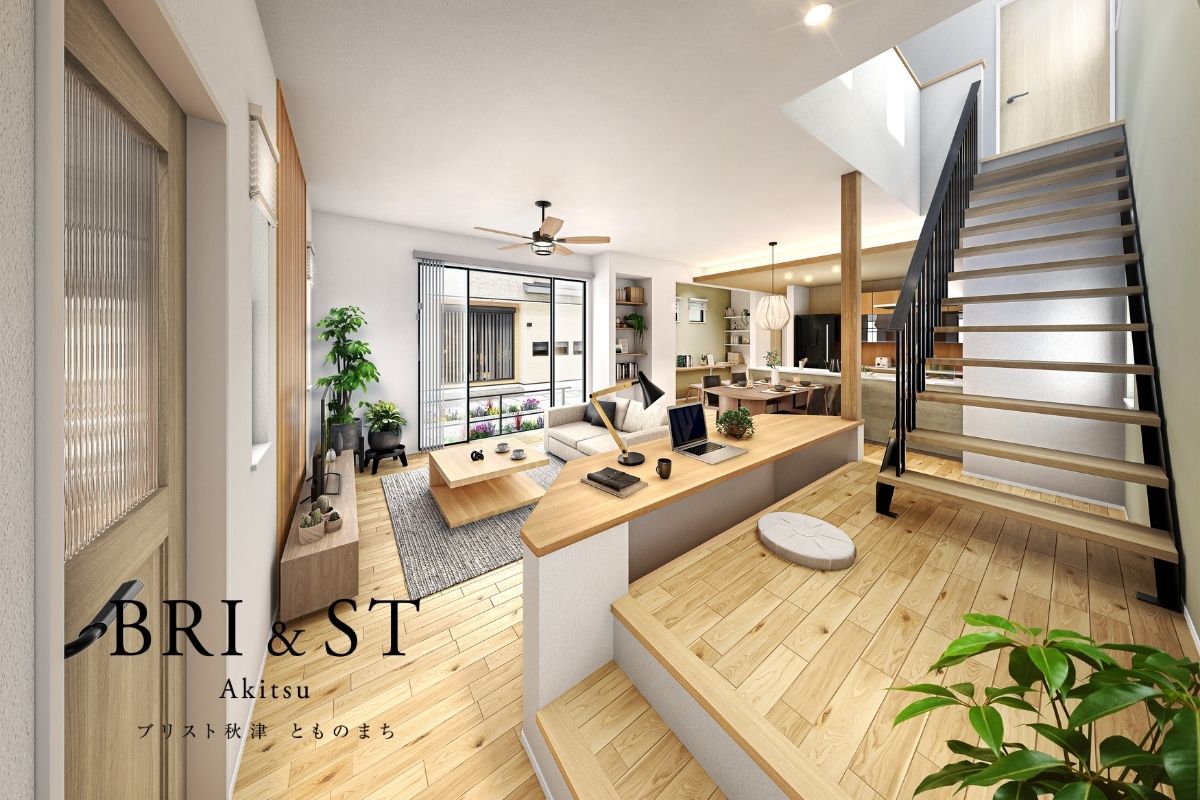 - 吹き抜けから光が降り注ぐLDKは、家族の笑顔が自然と集まる場所。階段横の小上がりで宿題をする子供を見守りながら、テラスと繋がる開放的な空間でゆったりと寛げます。※4号棟/2026年3月撮影