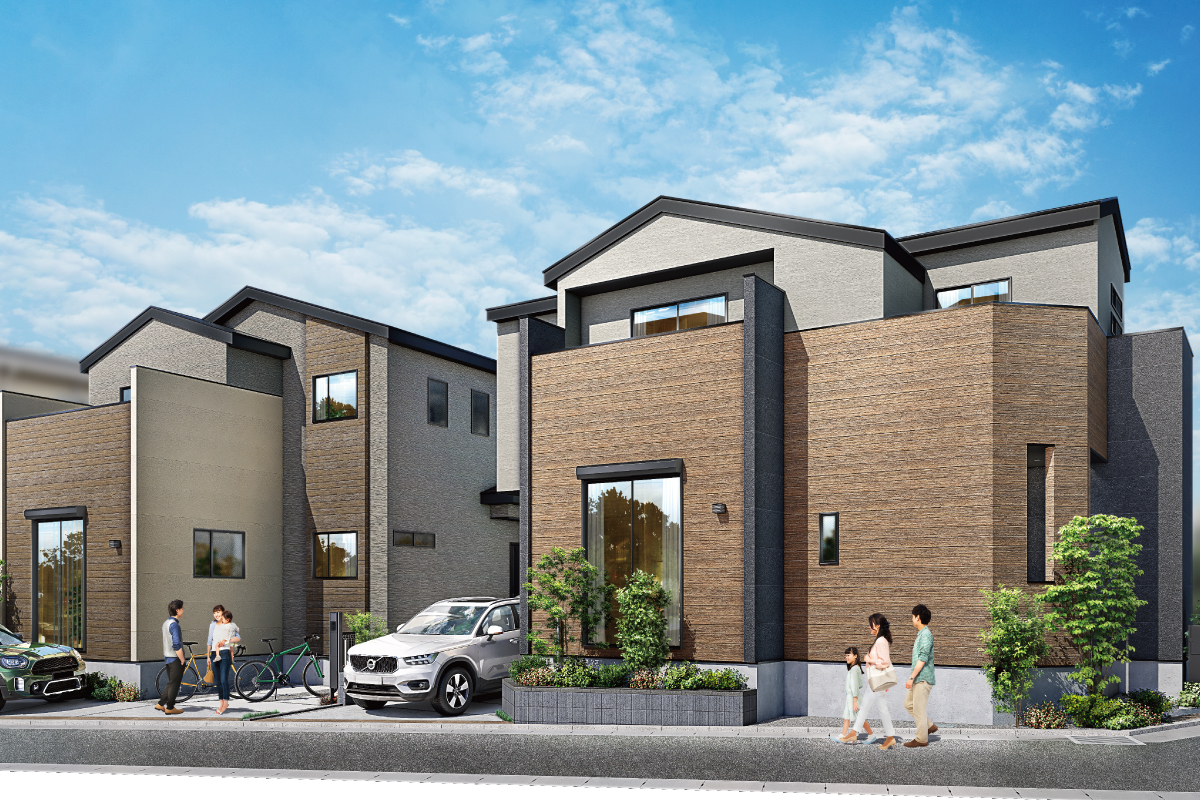 - 2邸それぞれにちがった魅力のプランを採用。それぞれの家族の想い描く暮らし方を受け止めながら、様々なライフシーンに心地よい時間を紡ぎます。※1号棟完成予想図